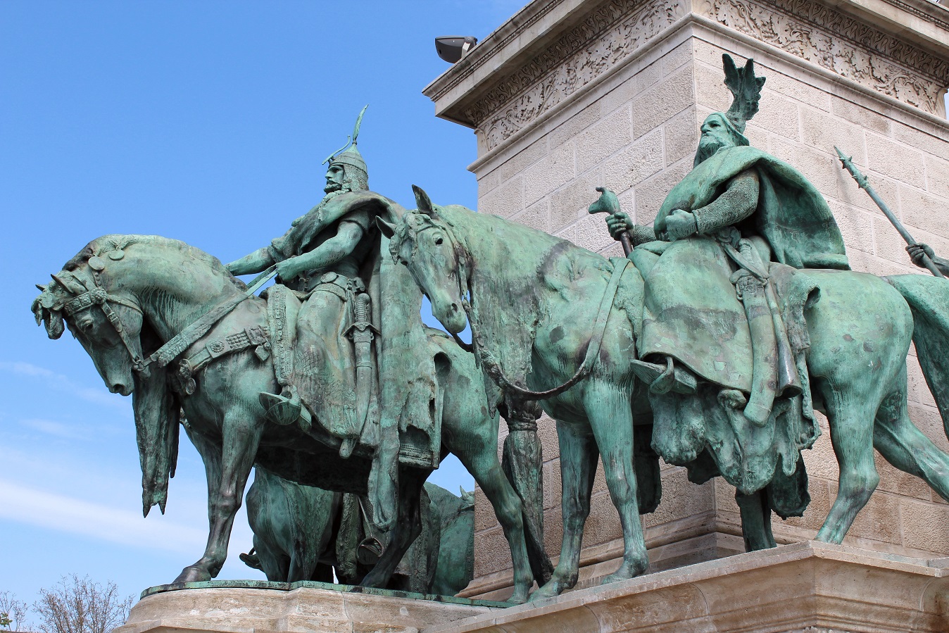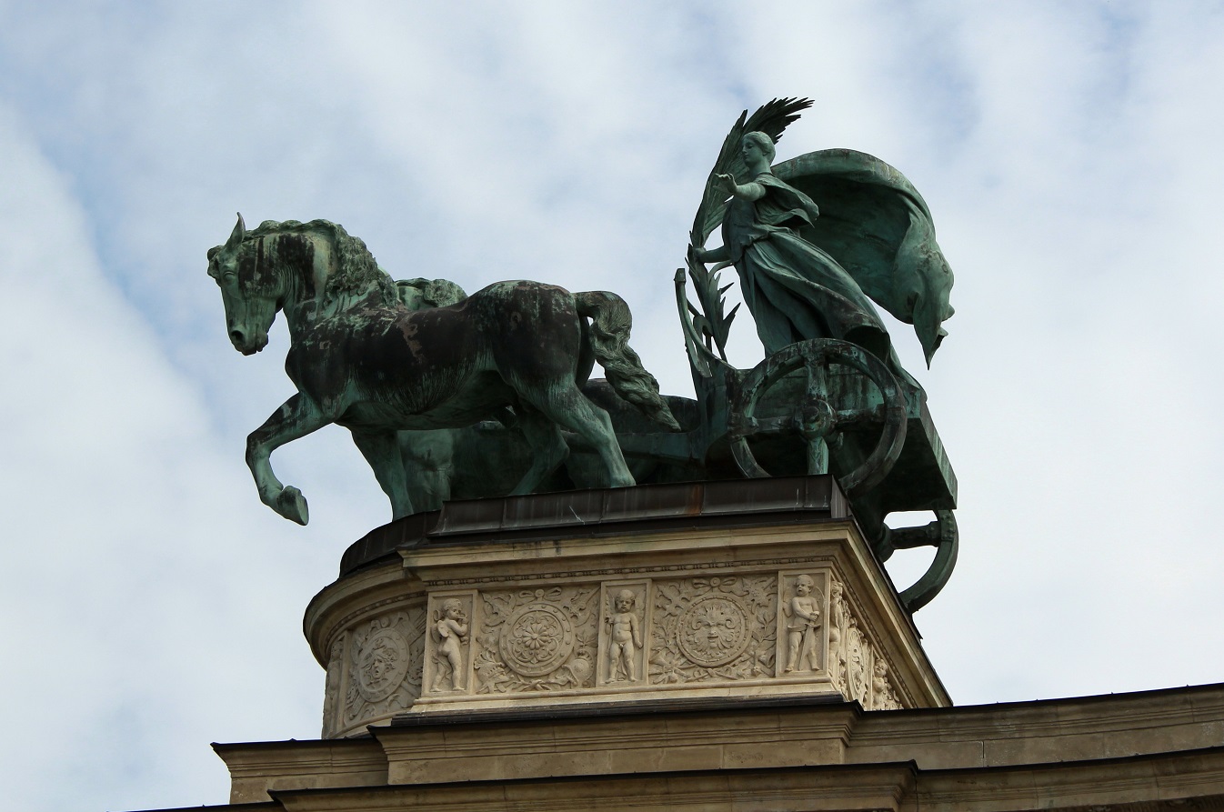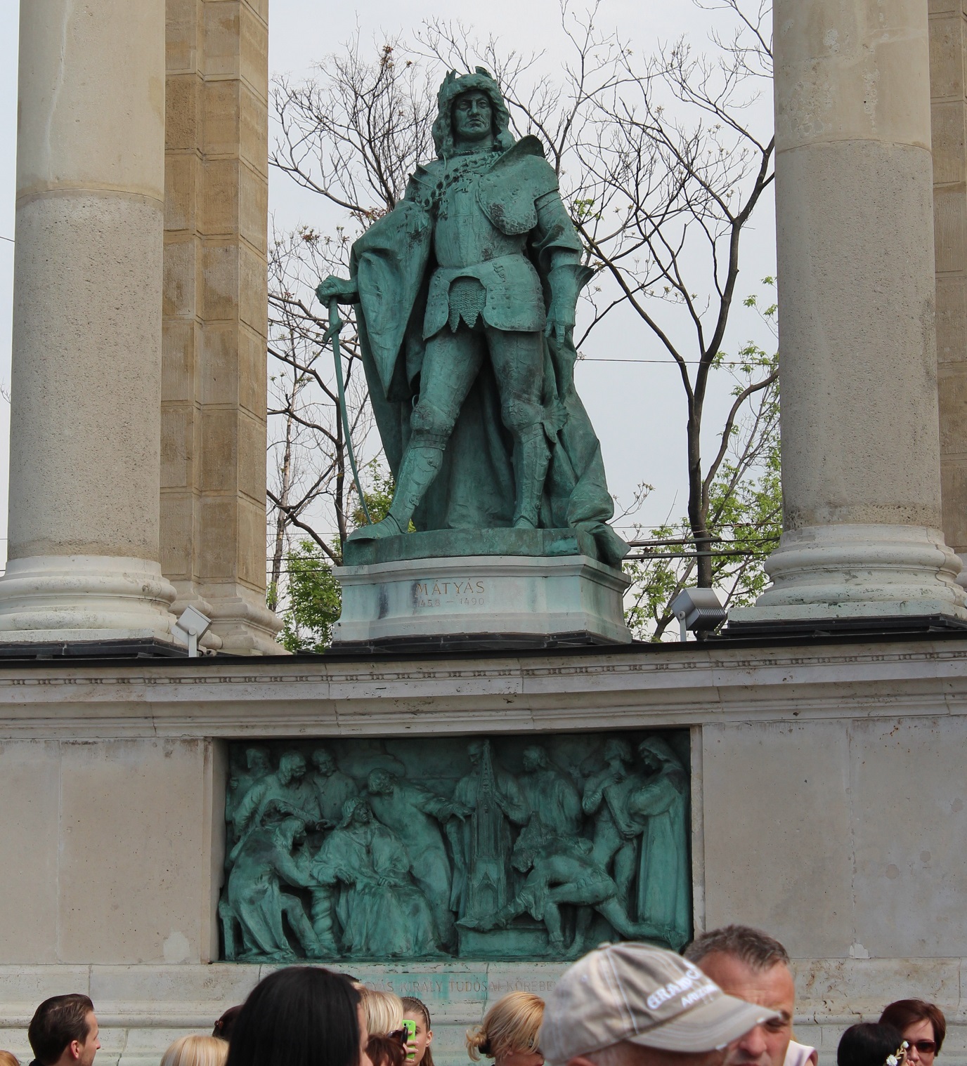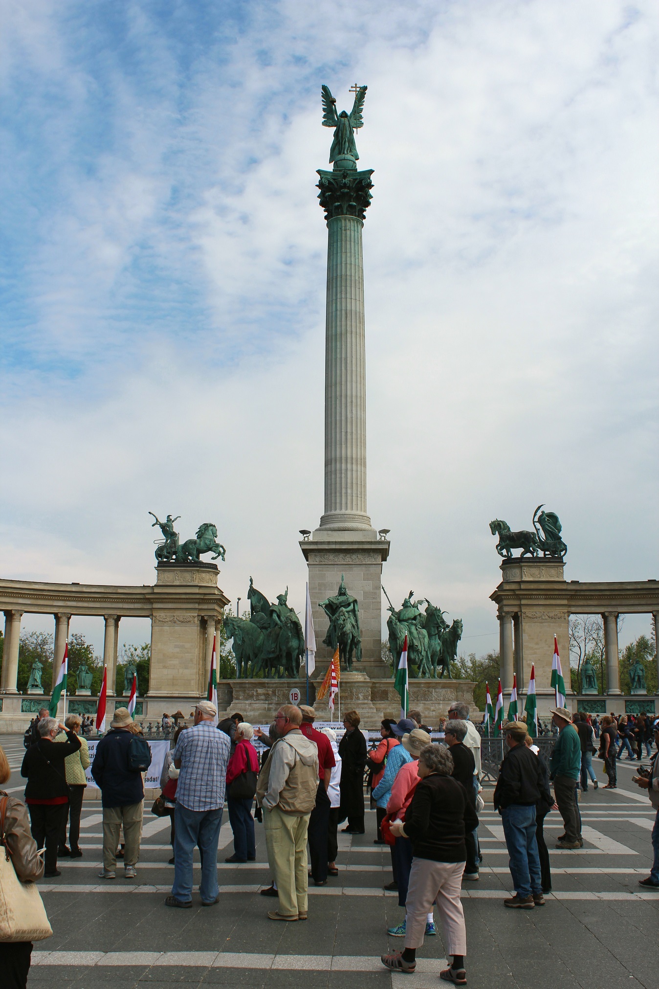[Millenium Monument, the column on the middle of the Square, surrounded by, among others, the leaders of the seven Magyar tribes who founded Hungary.]