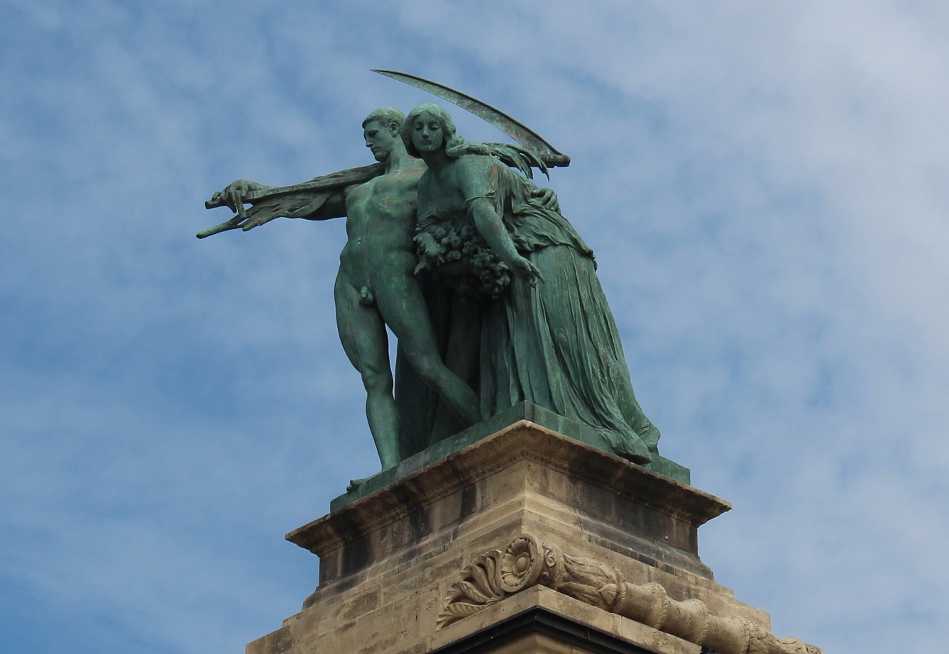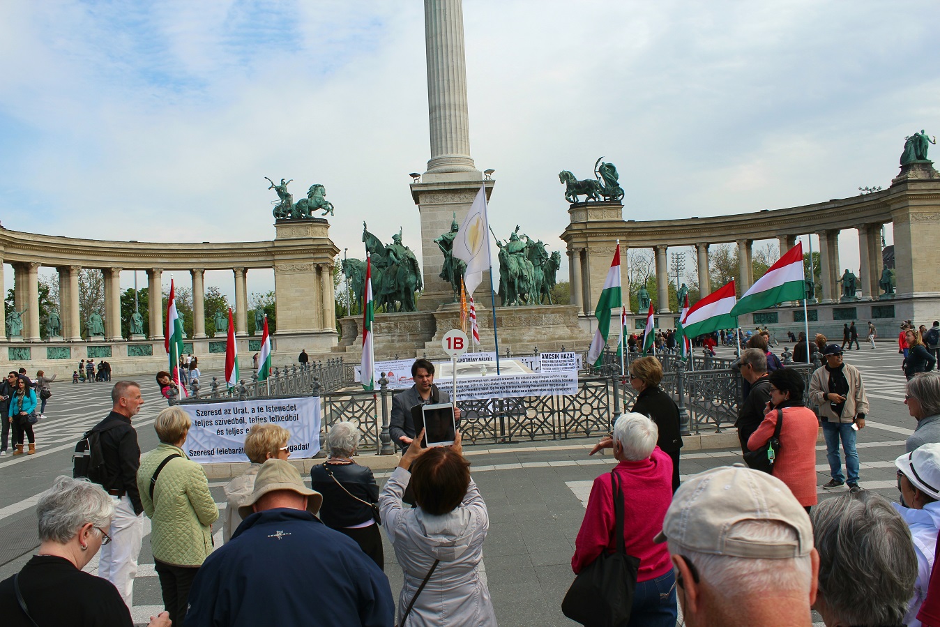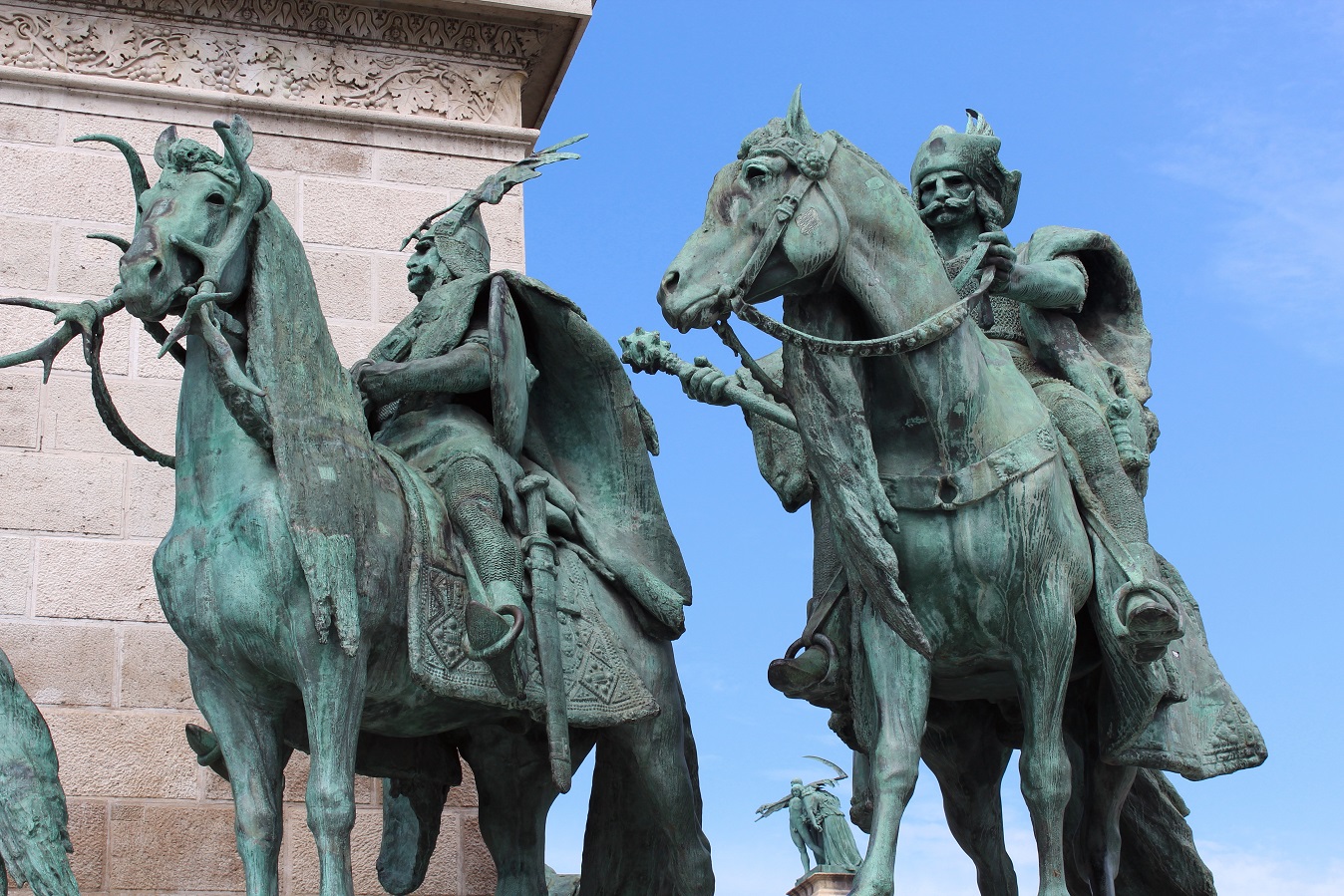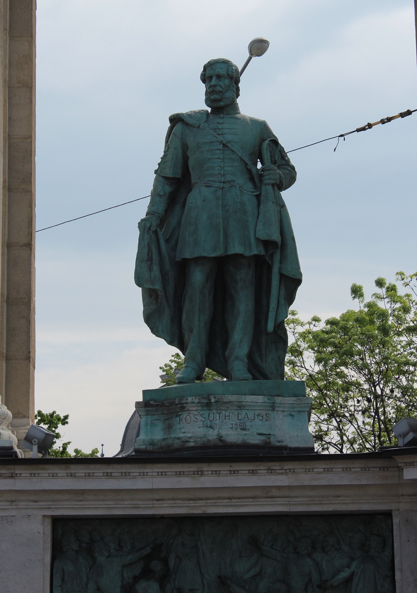 [Millenium Monument, the column on the middle of the Square, surrounded by, among others, the leaders of the seven Magyar tribes who founded Hungary.]