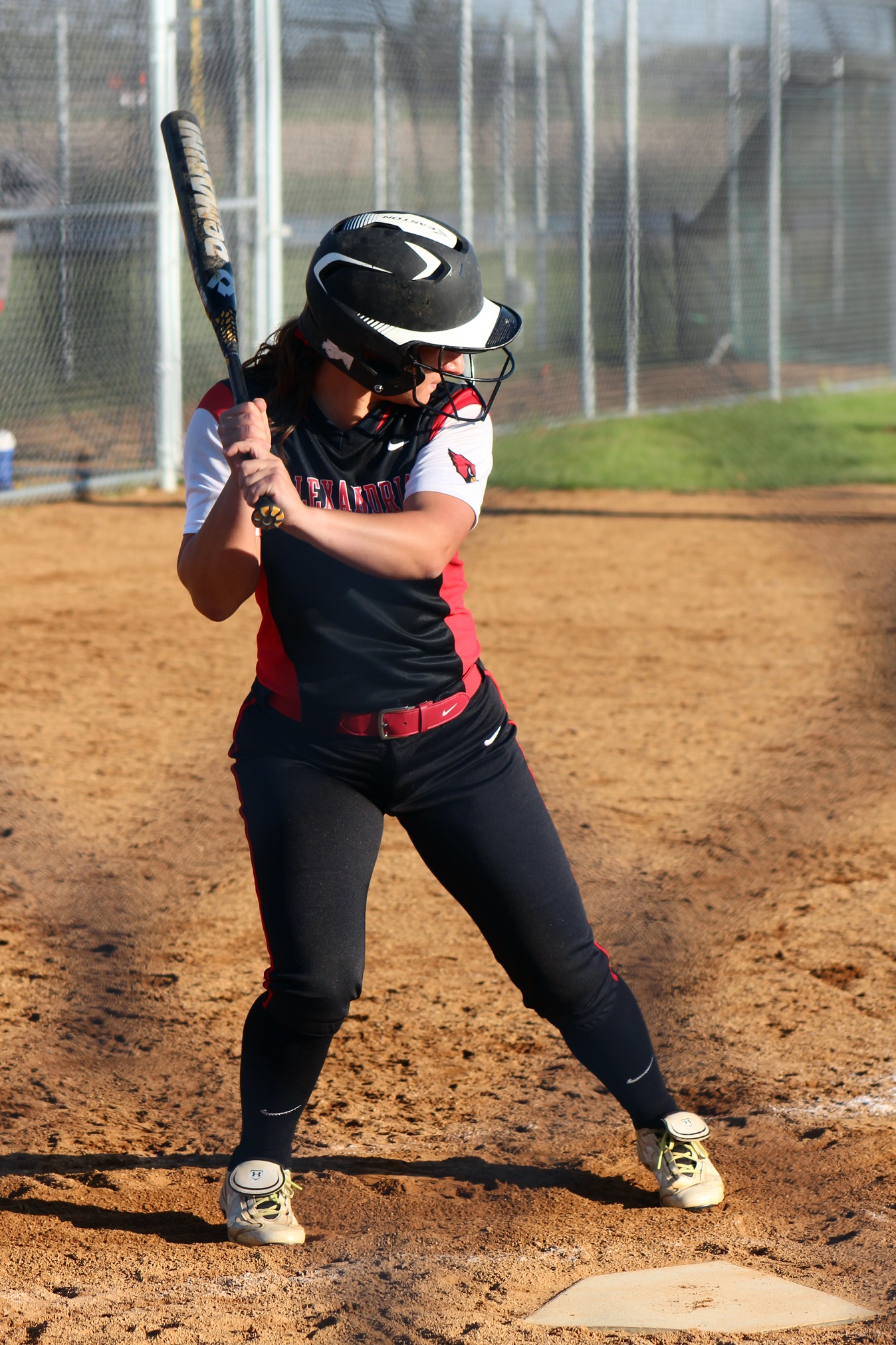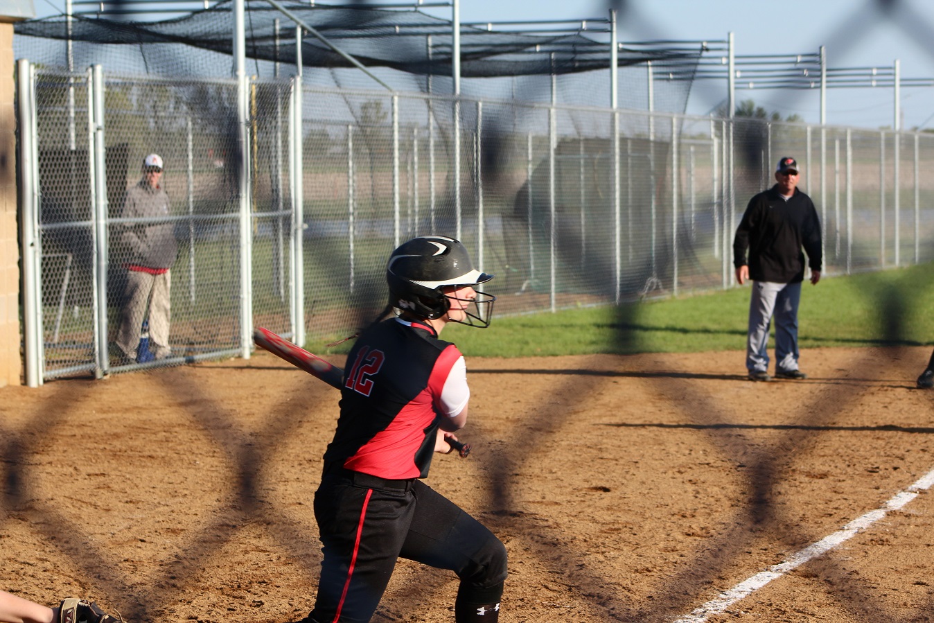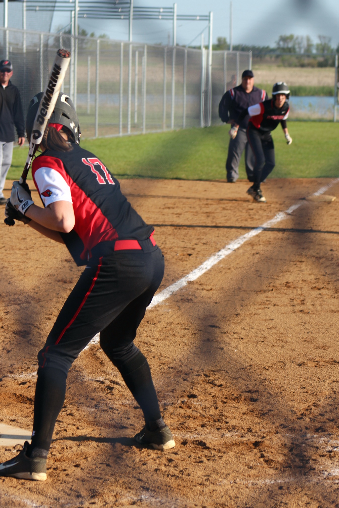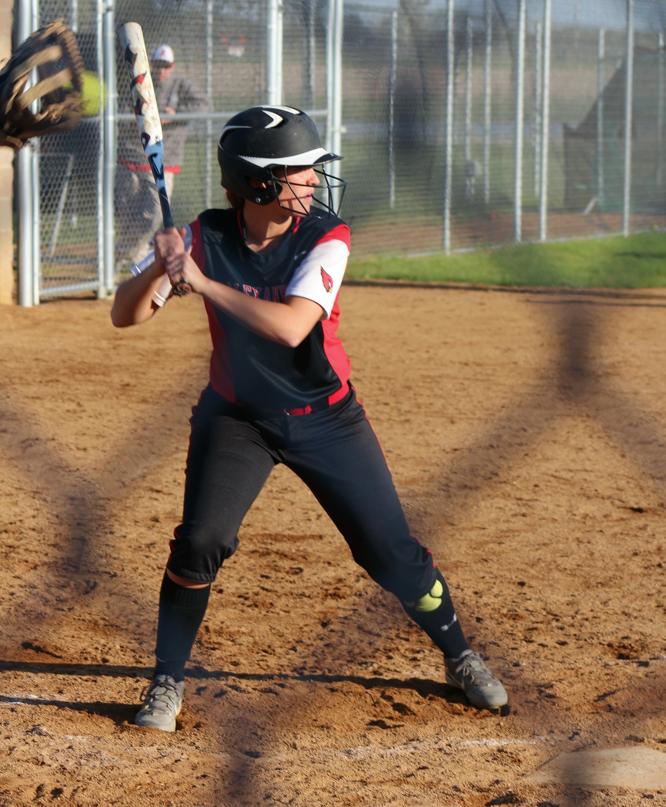 [Ellie Ronning, sophomore infielder, hit a nice line single to center here scoring Emma Ziegler, sophomore shortstop (and basketball), from 3rd. The Cards rallied with 2-run innings in the 4th, 5th, and 6th, that potentially could have been much more.]