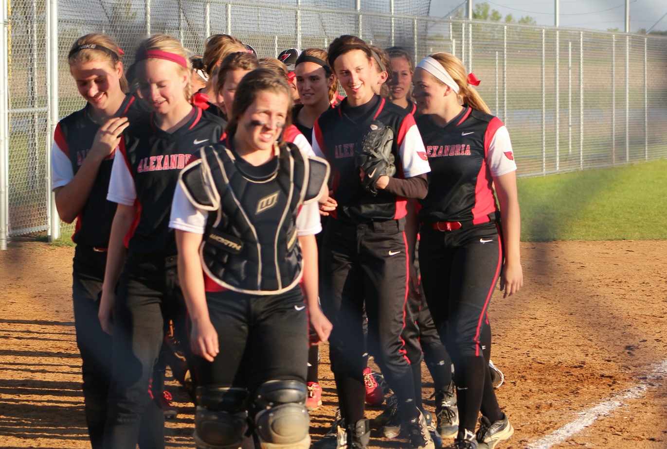 [Sophomore catcher McKenzie Revering (Little Rev from hockey) leads the handshake parade.]