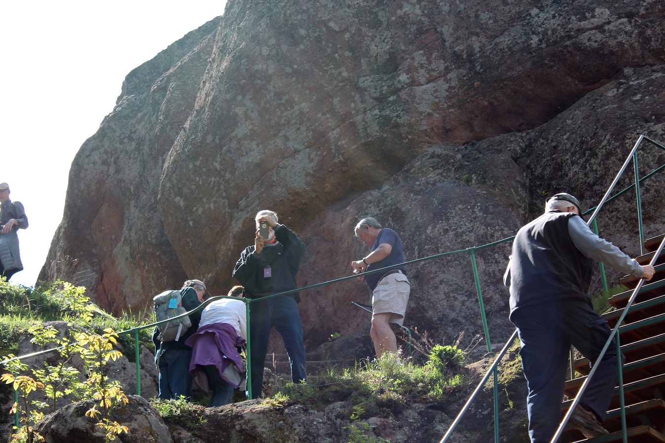 [We’re going up there . . . to some degree. The Super (and Karen and Bill) did all 200 steps to the top of the rocks – I went halfway and decided it was too hot to go further. The two rocks on the left are Adam and Eve with the First Kiss. ]