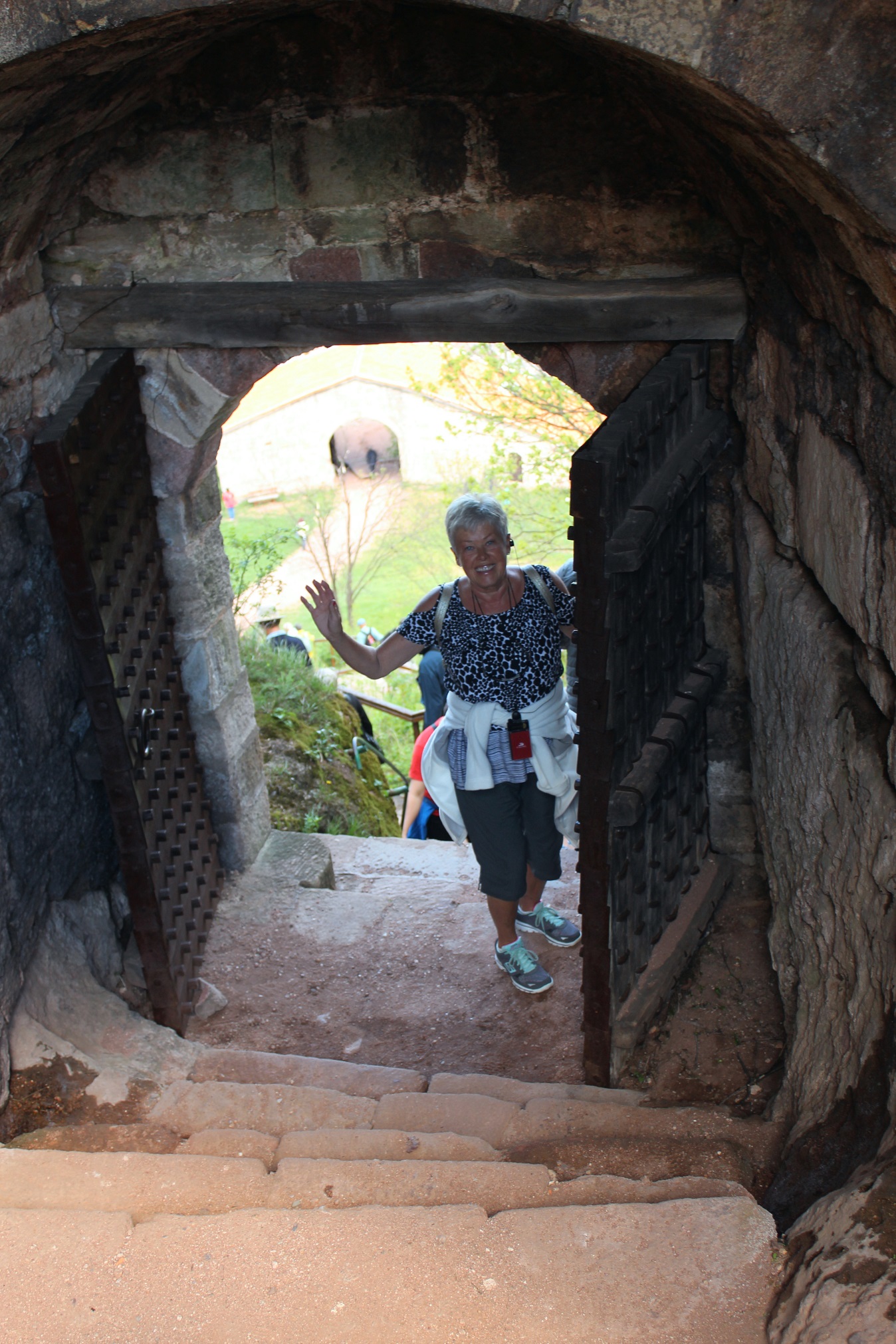 [At the halfway point, 100 steps up, Karen stops for a photo op.]