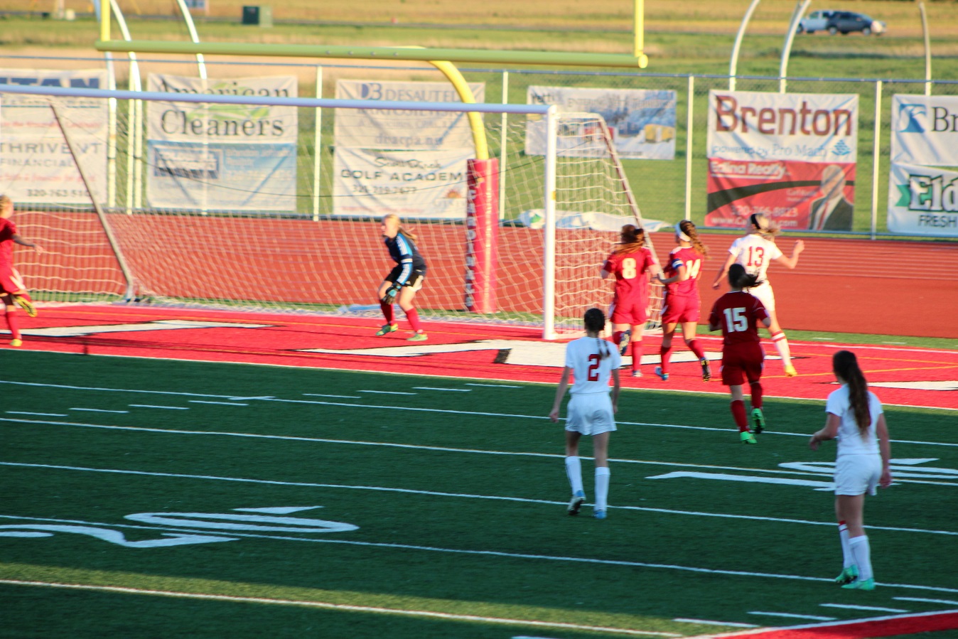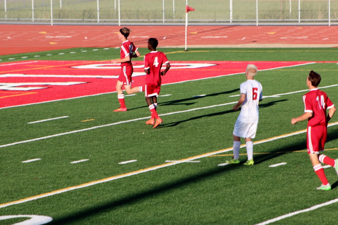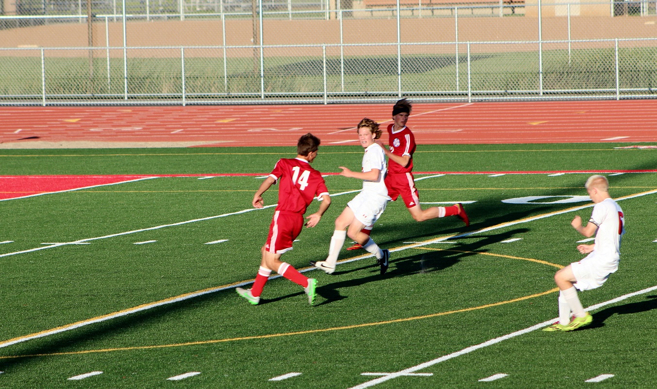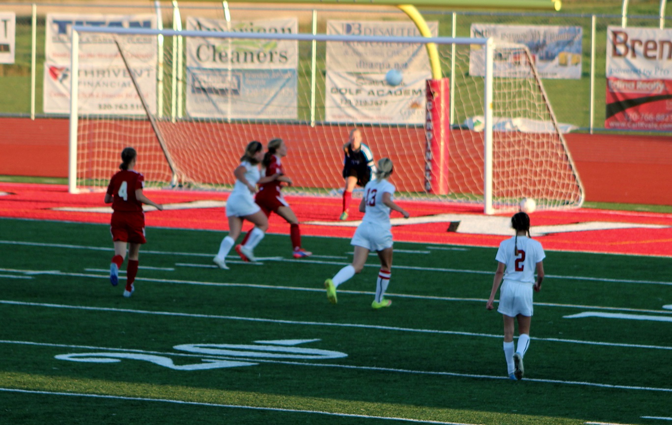 [A good rush by the Cards. Our goals were by senior Devon Crowe (6) assisted by senior Kagan Foster (11), and later Foster scored on an assist from Crowe.]