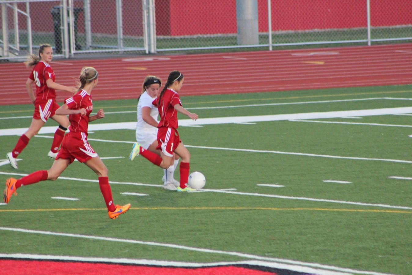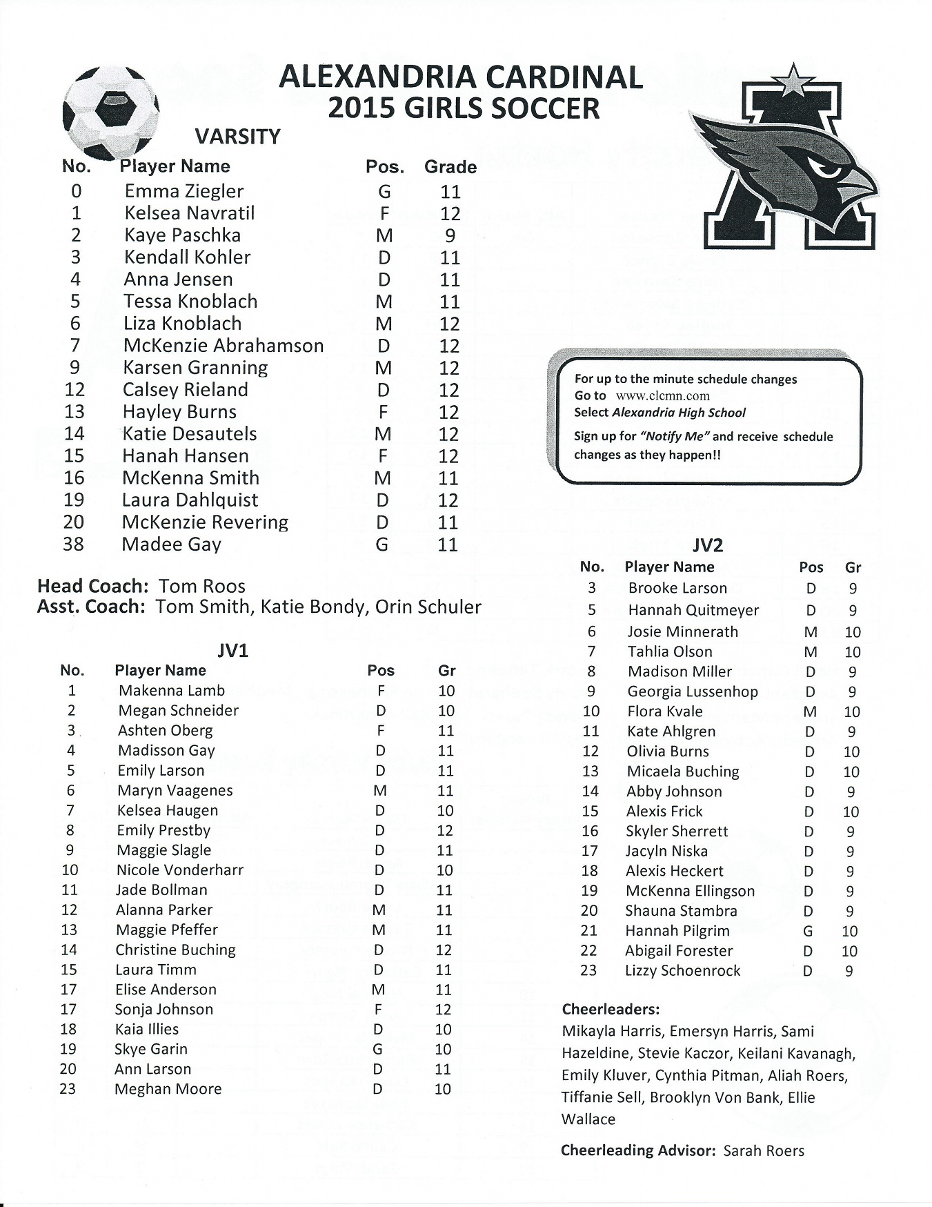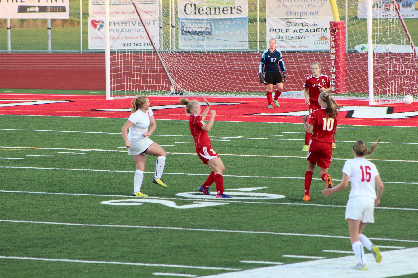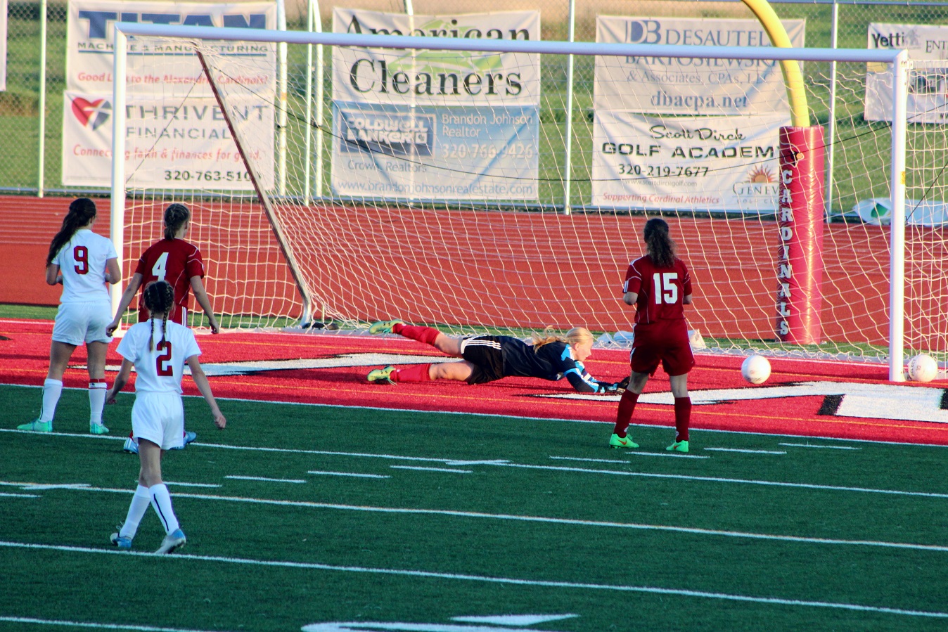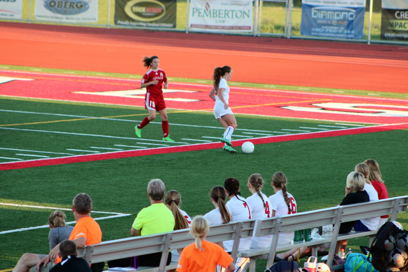 [A good rush by the Cards. Our goals were by senior Devon Crowe (6) assisted by senior Kagan Foster (11), and later Foster scored on an assist from Crowe.]