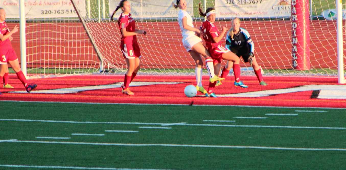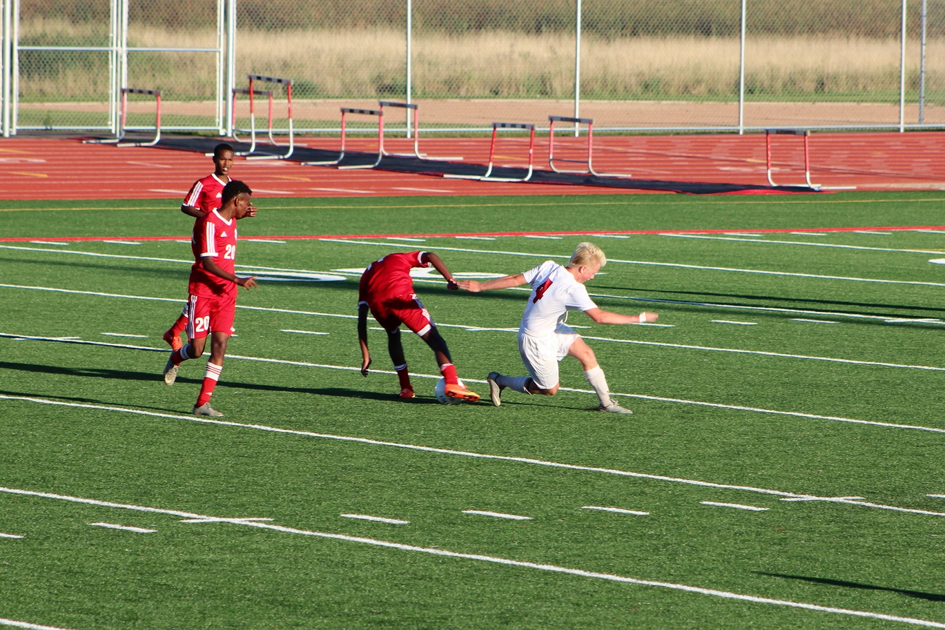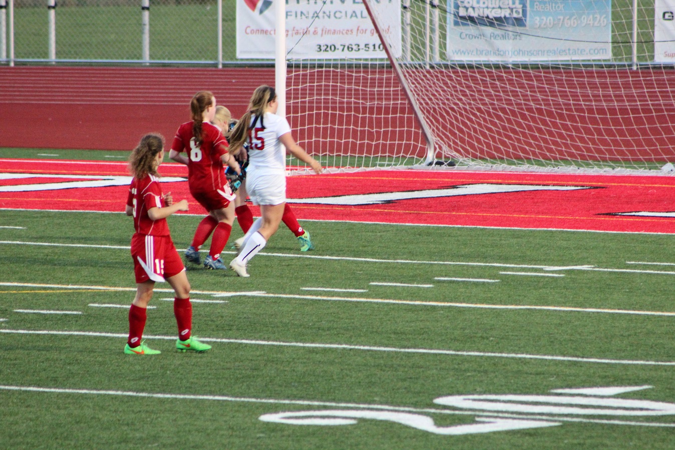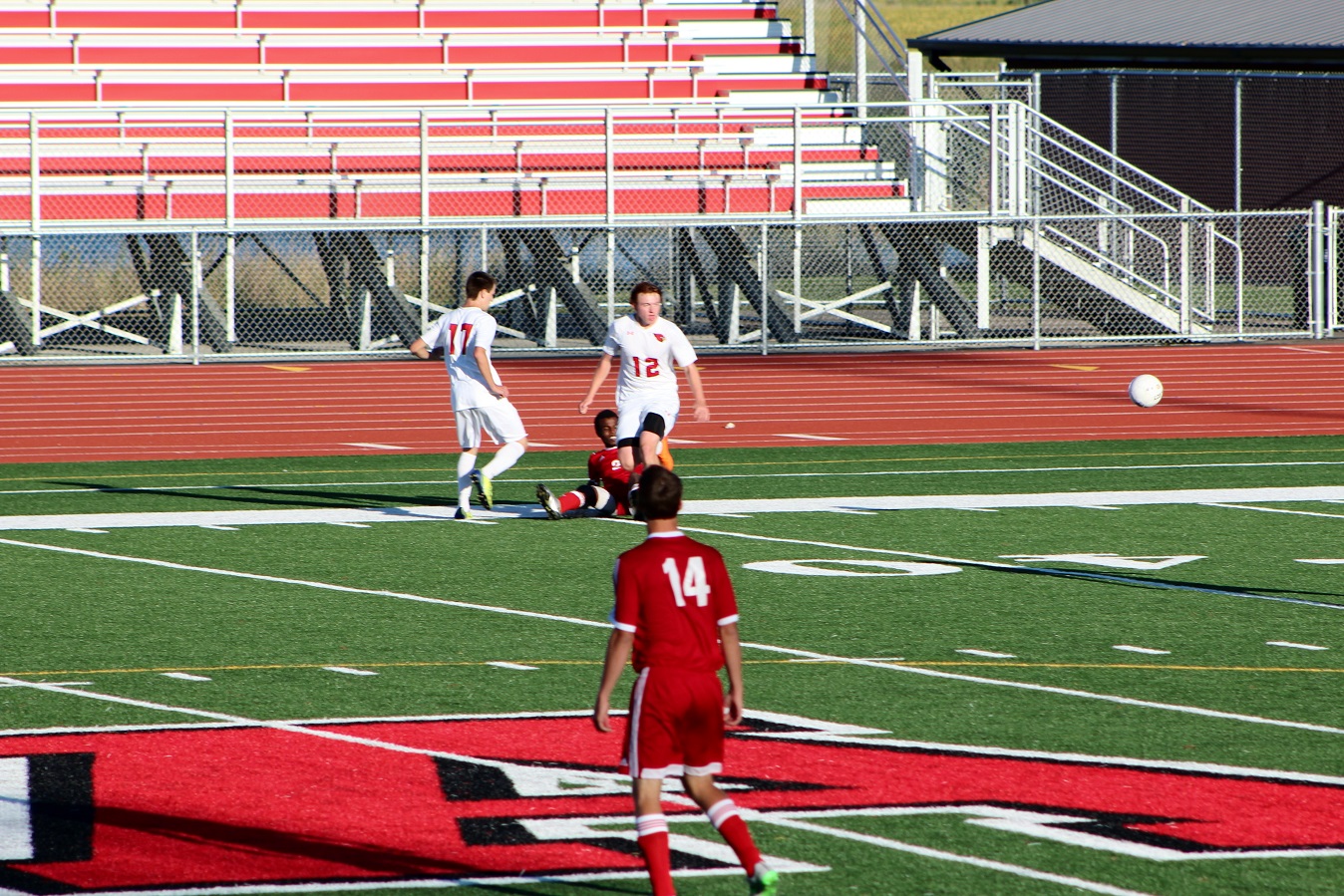 [A good rush by the Cards. Our goals were by senior Devon Crowe (6) assisted by senior Kagan Foster (11), and later Foster scored on an assist from Crowe.]