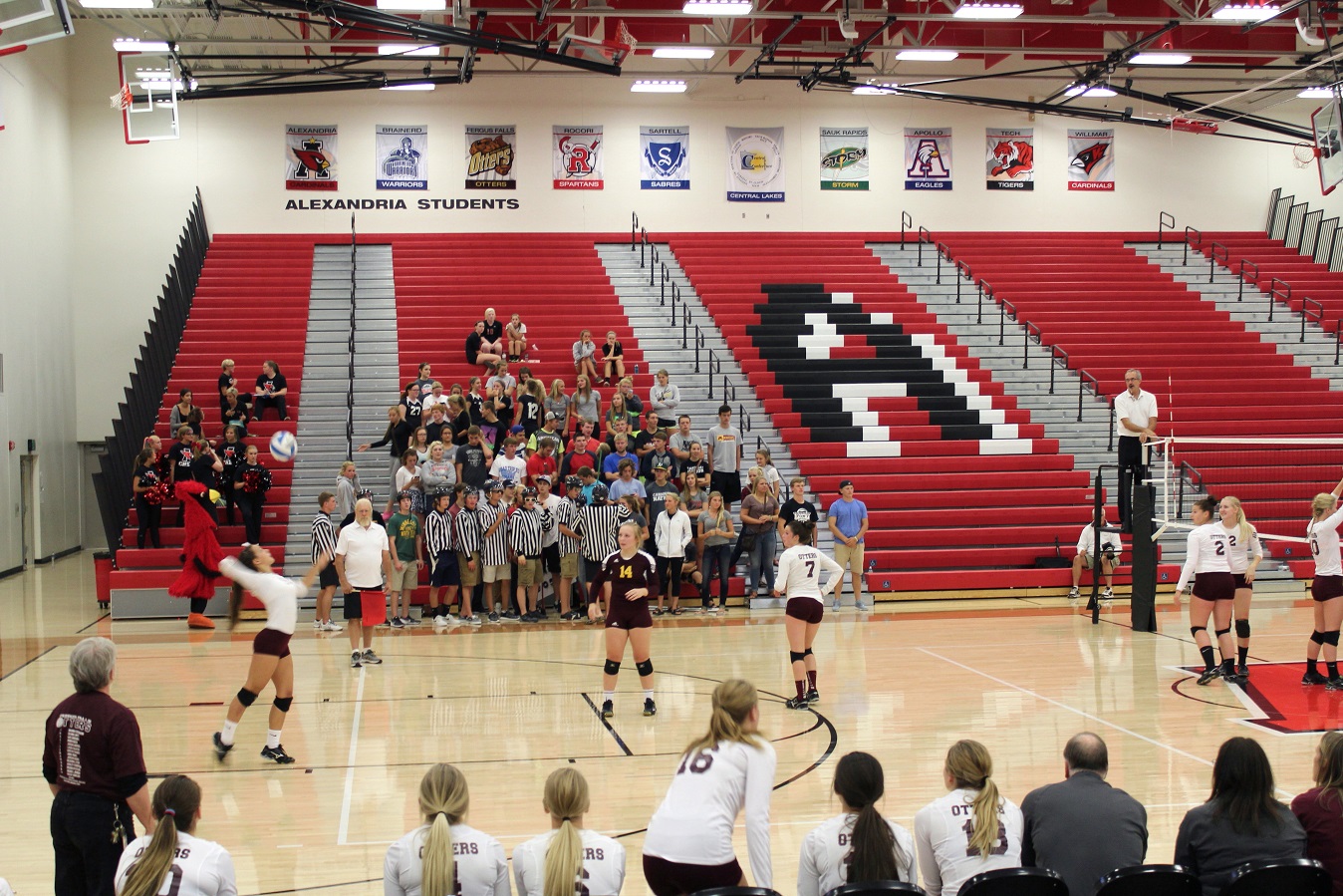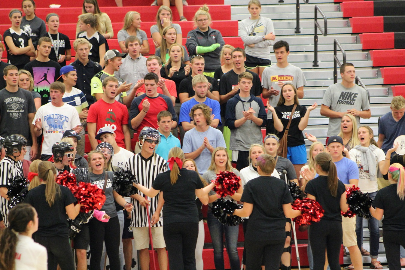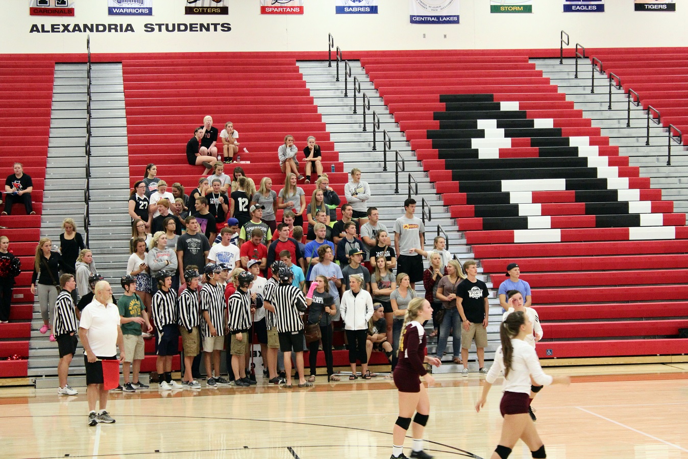 [Game three of the evening – volleyball v. the Fergus Falls Otters. You may recognize the fire marshal and Corliss sitting to the right on the other side of the railing – they too were at halves of both soccer games.]