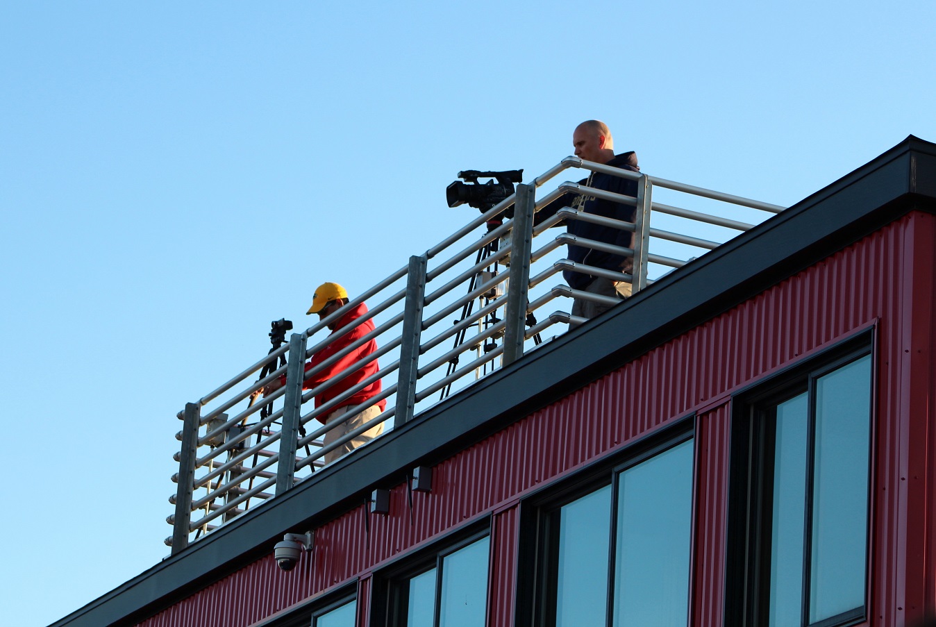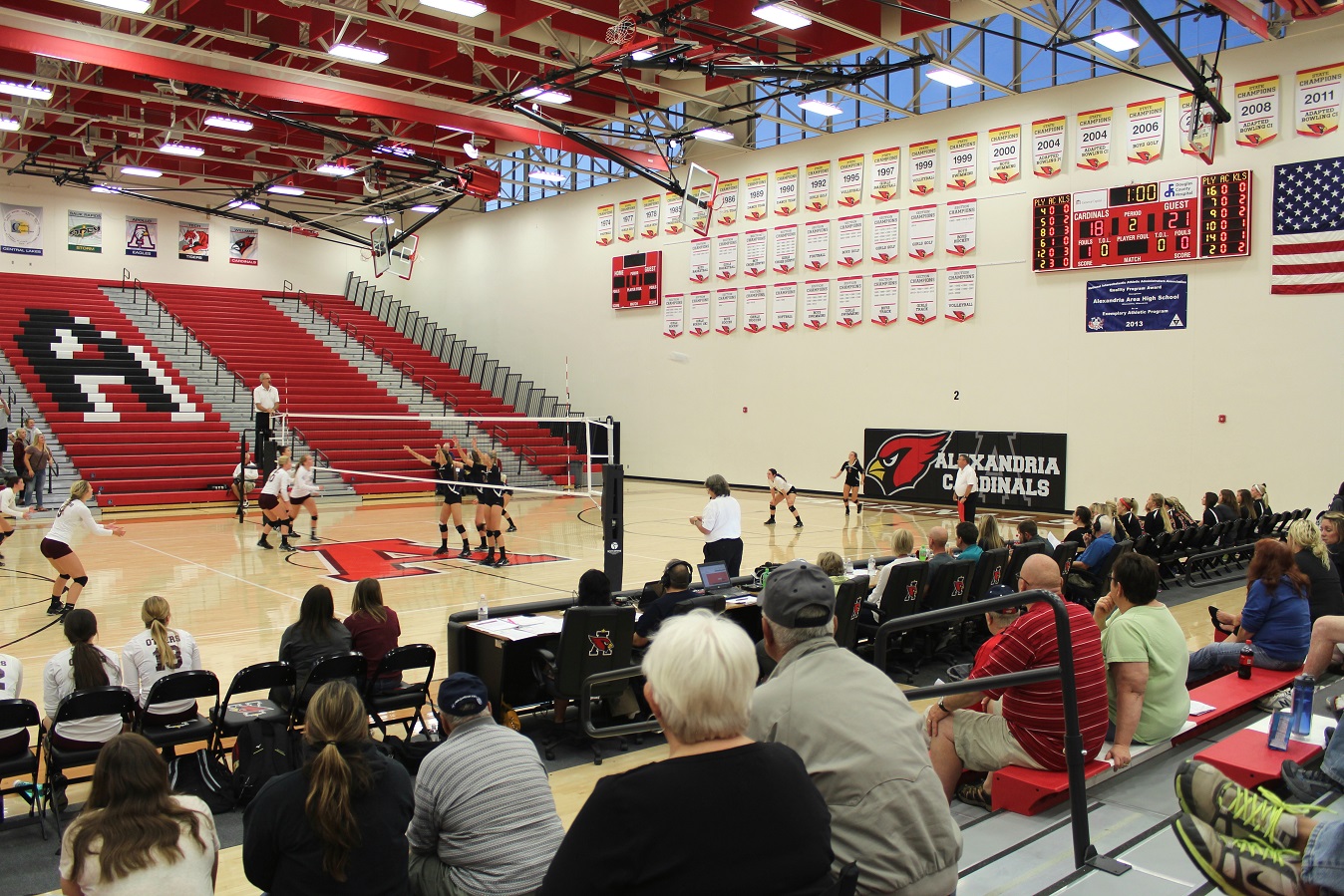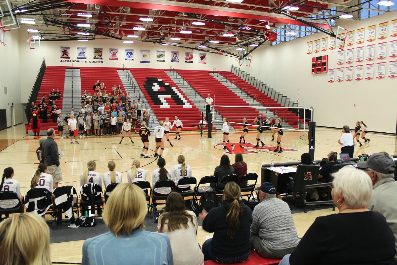 [Game three of the evening – volleyball v. the Fergus Falls Otters. You may recognize the fire marshal and Corliss sitting to the right on the other side of the railing – they too were at halves of both soccer games.]