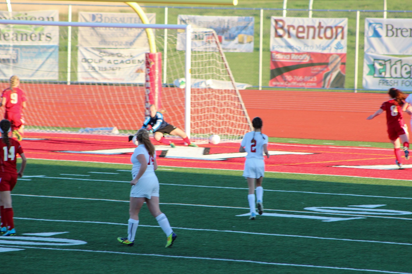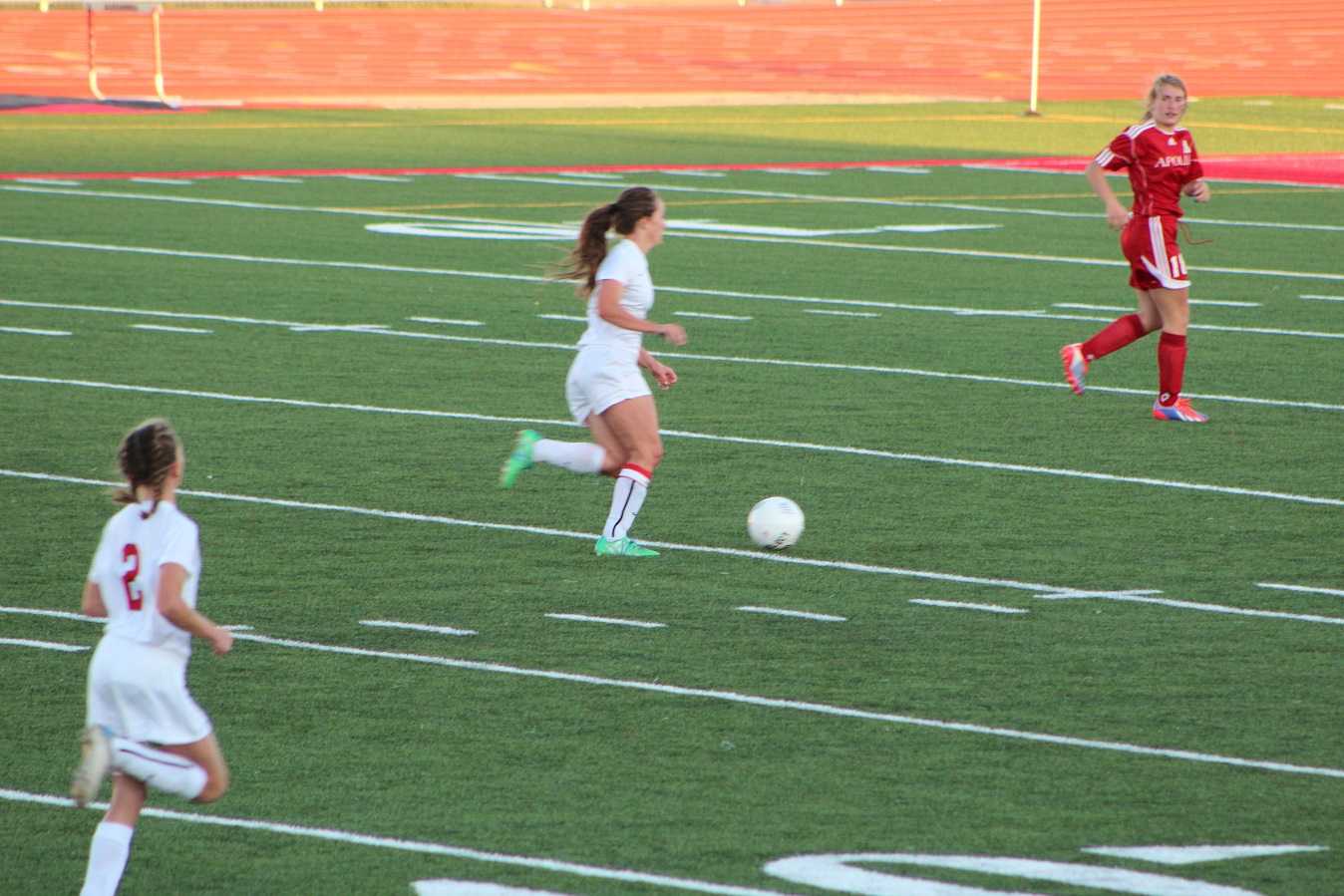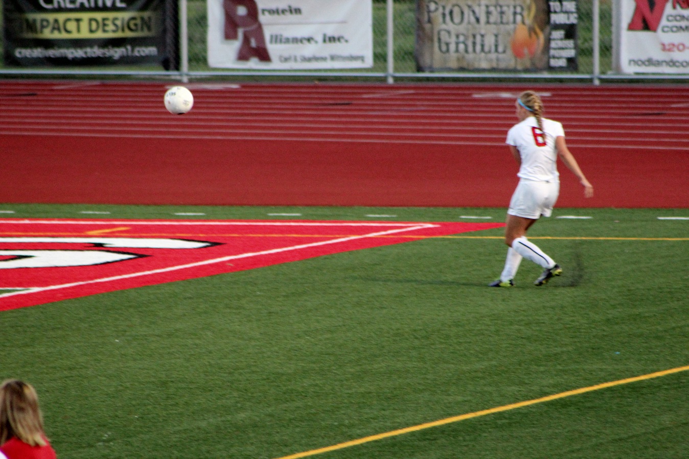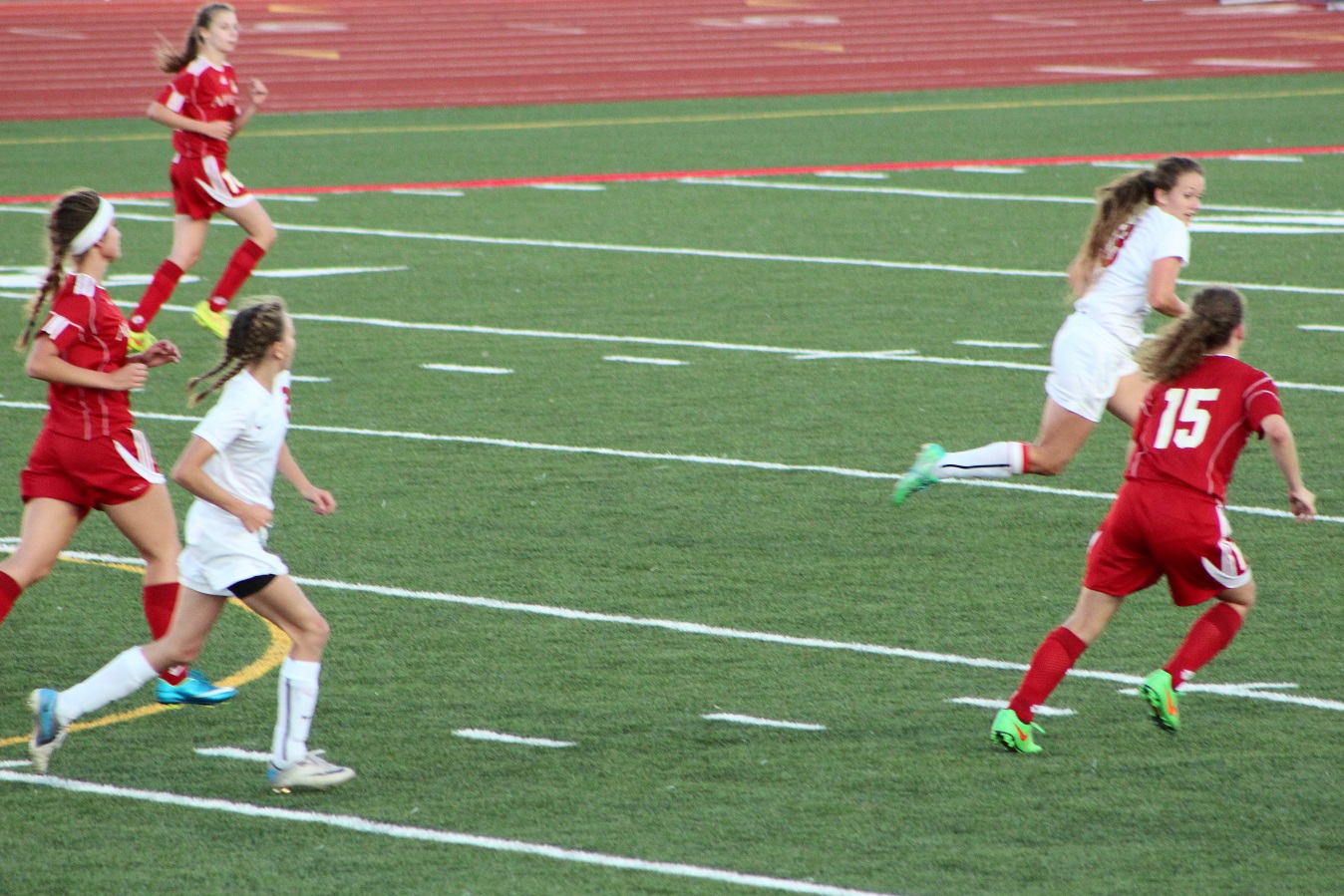 [OK, I have to let the cat out of the bag here. I had no idea at the time of this shot that she would be the star of the game. I left when we were behind 2 – 1 to cover volleyball, and I didn’t see our goal, as I was leaving. Ms. Burns scored all three goals in a 3 – 2 win, the last with 39 seconds left in the game. It was fitting – I thought we had the better of the play before I left, and obviously throughout the game as we had a 22 – 8 shot advantage.]