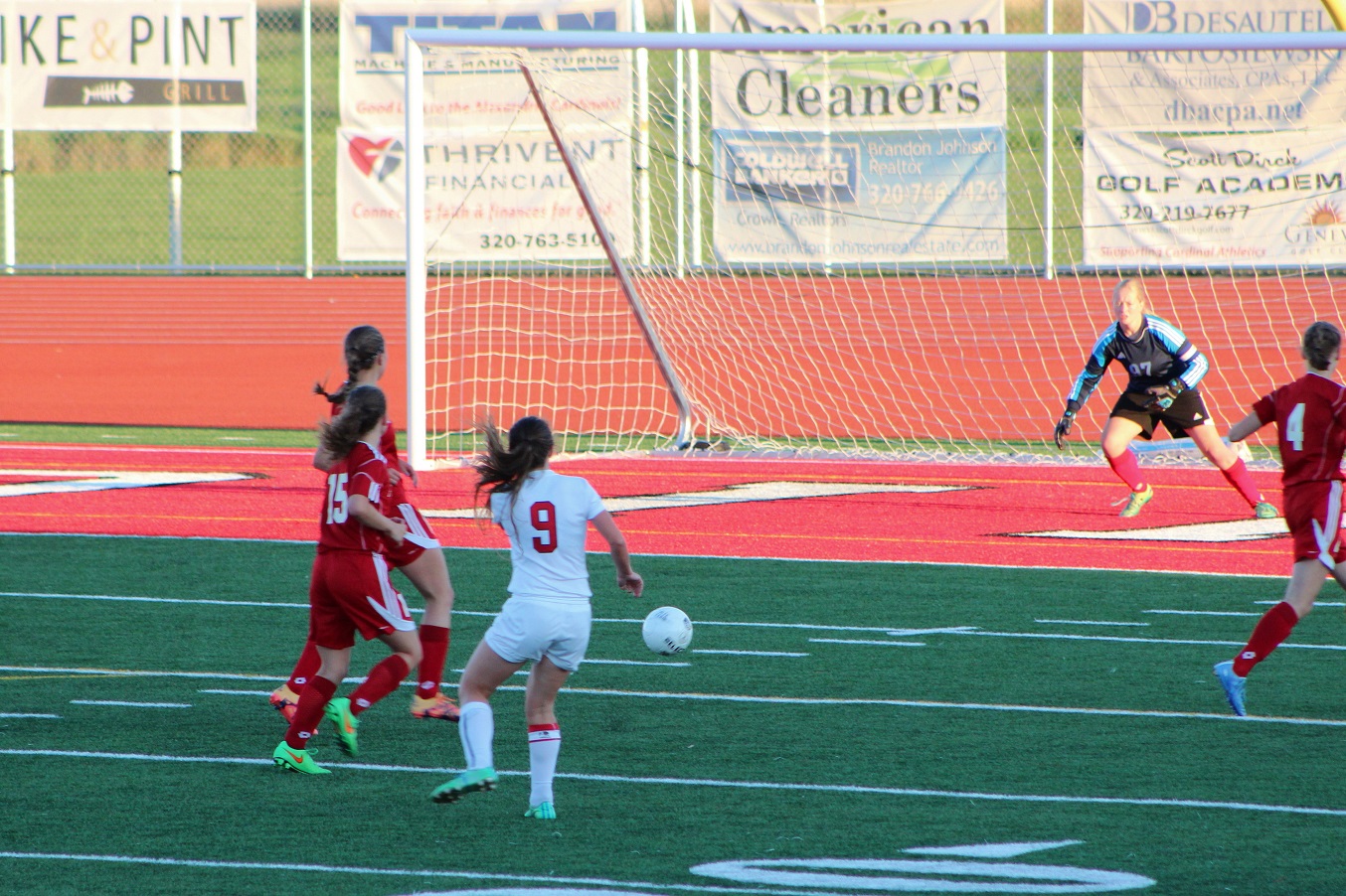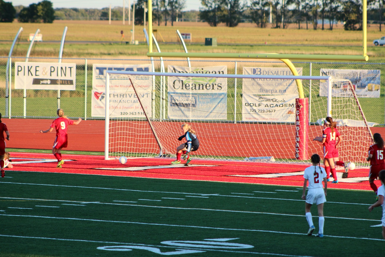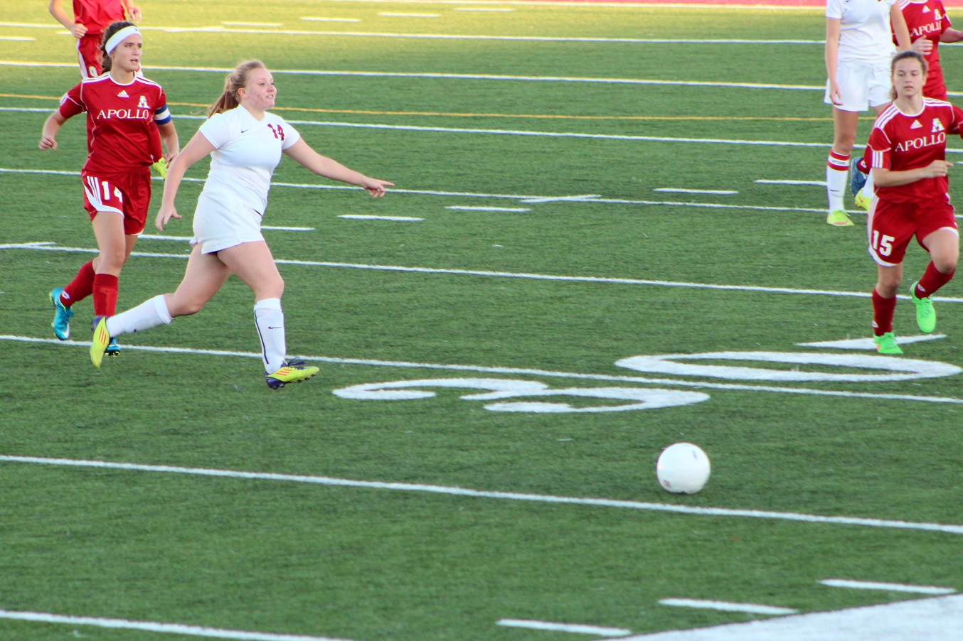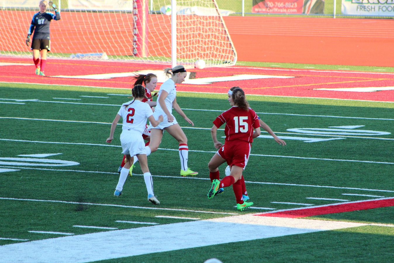 [OK, I have to let the cat out of the bag here. I had no idea at the time of this shot that she would be the star of the game. I left when we were behind 2 – 1 to cover volleyball, and I didn’t see our goal, as I was leaving. Ms. Burns scored all three goals in a 3 – 2 win, the last with 39 seconds left in the game. It was fitting – I thought we had the better of the play before I left, and obviously throughout the game as we had a 22 – 8 shot advantage.]