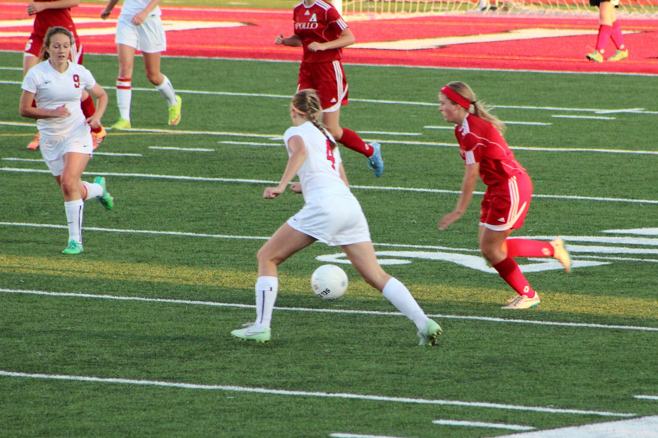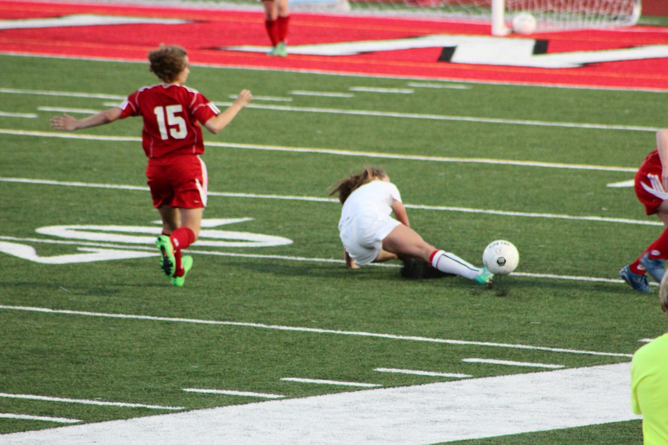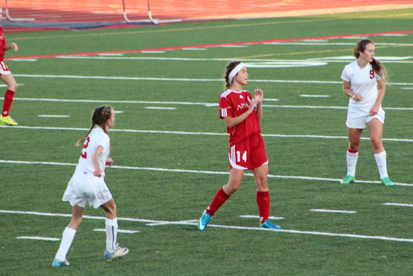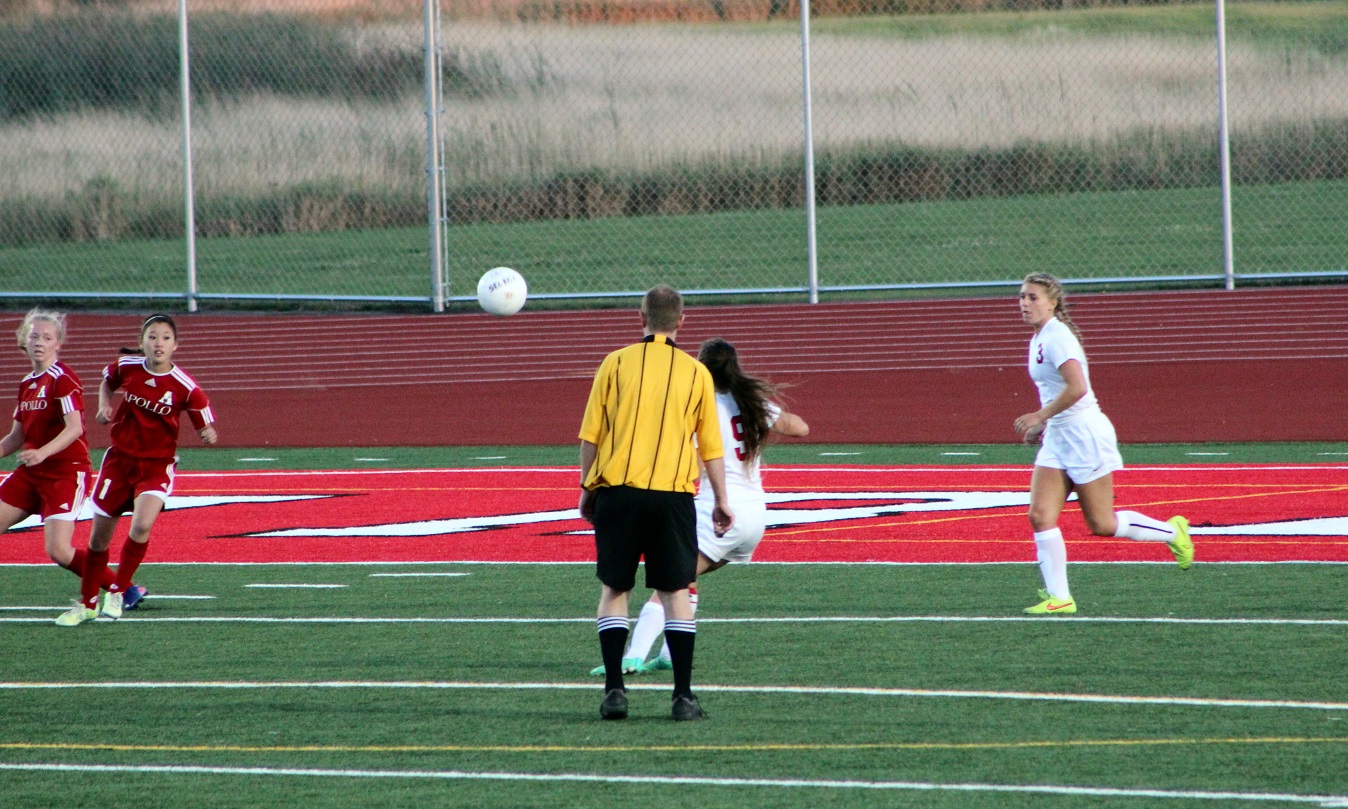 [OK, I have to let the cat out of the bag here. I had no idea at the time of this shot that she would be the star of the game. I left when we were behind 2 – 1 to cover volleyball, and I didn’t see our goal, as I was leaving. Ms. Burns scored all three goals in a 3 – 2 win, the last with 39 seconds left in the game. It was fitting – I thought we had the better of the play before I left, and obviously throughout the game as we had a 22 – 8 shot advantage.]