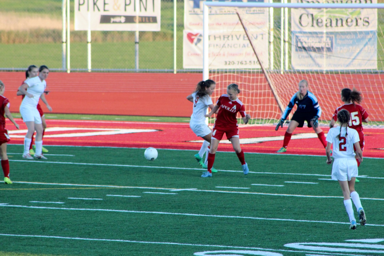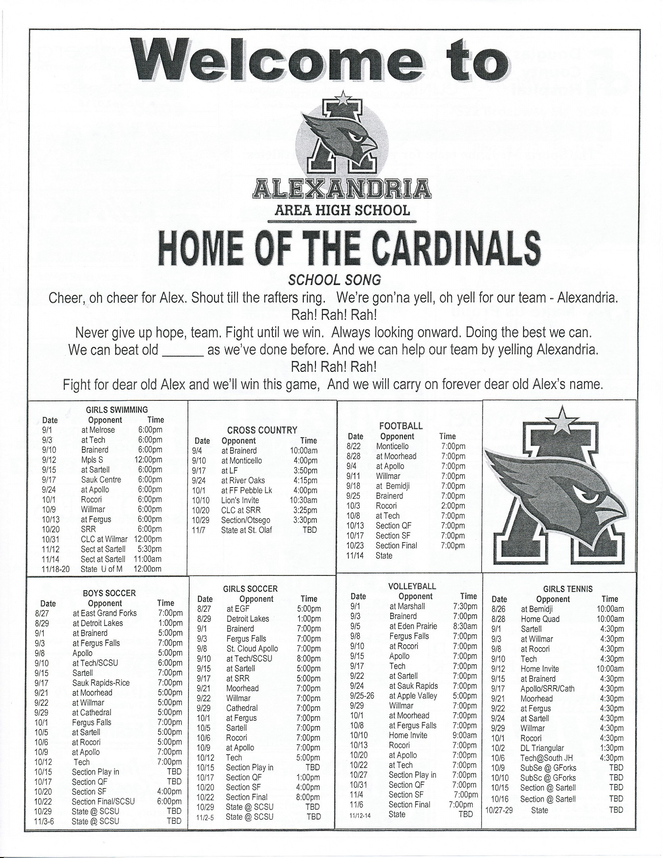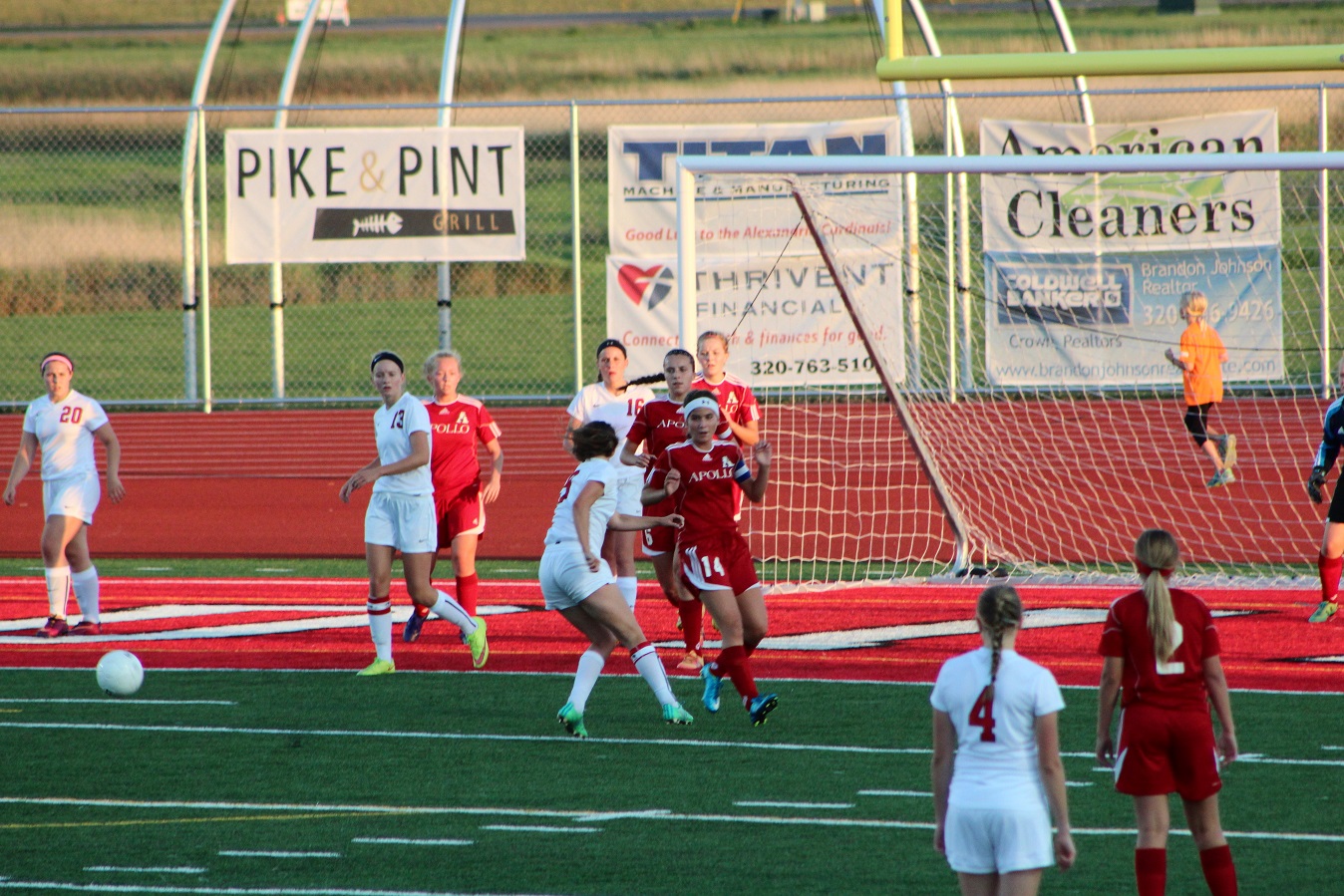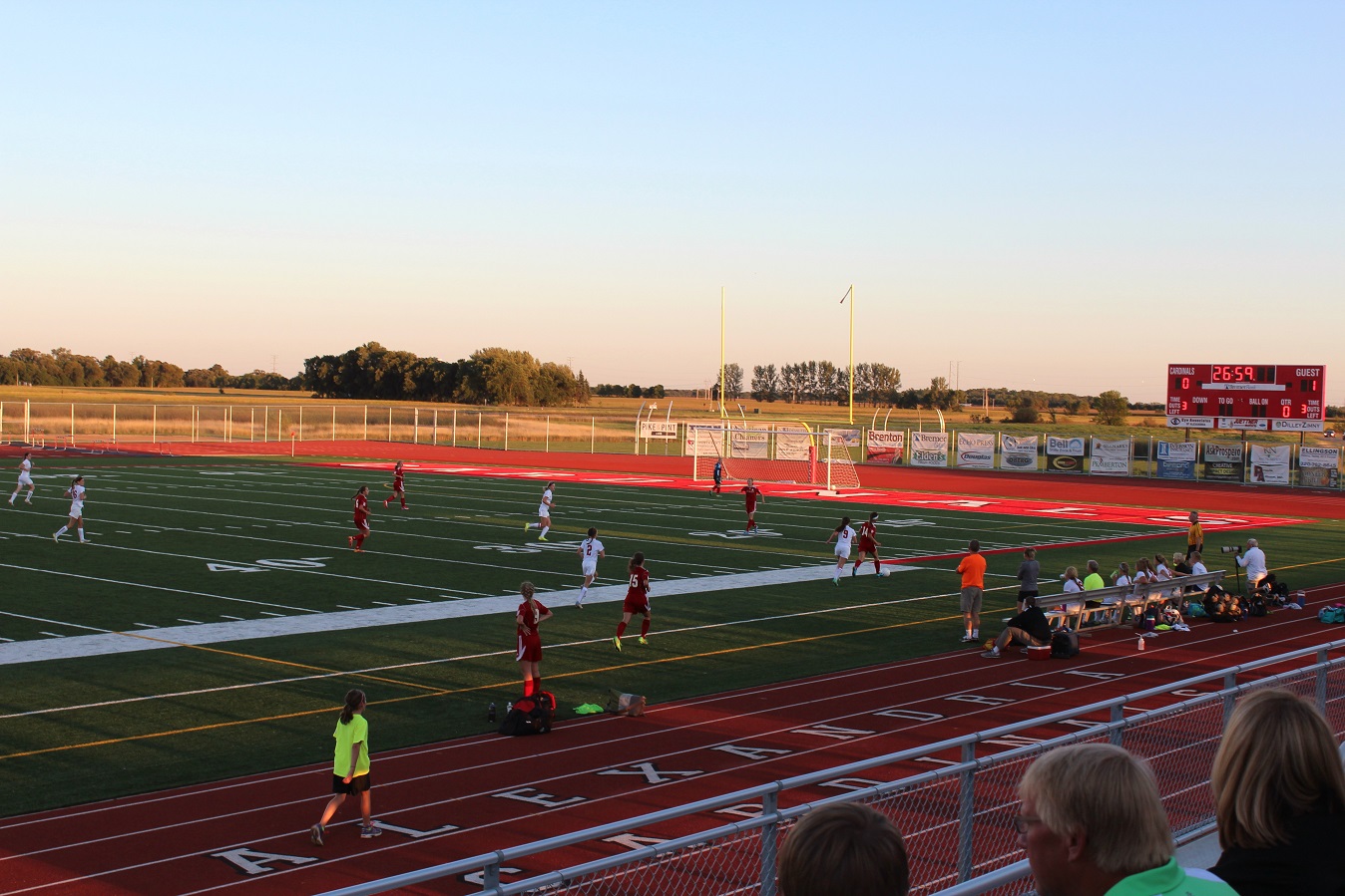 [The very next day I was at my post at the high school, the first day of school at AAHS, and I was determined to cover all events. It’s not like games haven’t been played yet – for Pete’s sake, the football team has already played three times and the volleyball team’s overall record would be 4 – 4 by the end of the evening – but I don’t feel like “playing” until school starts. When I arrived in the parking lot the scoreboard for the boys’ soccer game showed 6 – 0 – oops! We were undefeated going into the game but were hosting defending state champs, St. Cloud Apollo. By the time I walked to the stadium, bought my ticket, and reached the stands, we had scored twice. That was it, a 6 – 2 final. They were very good but we held them even in the second half.]