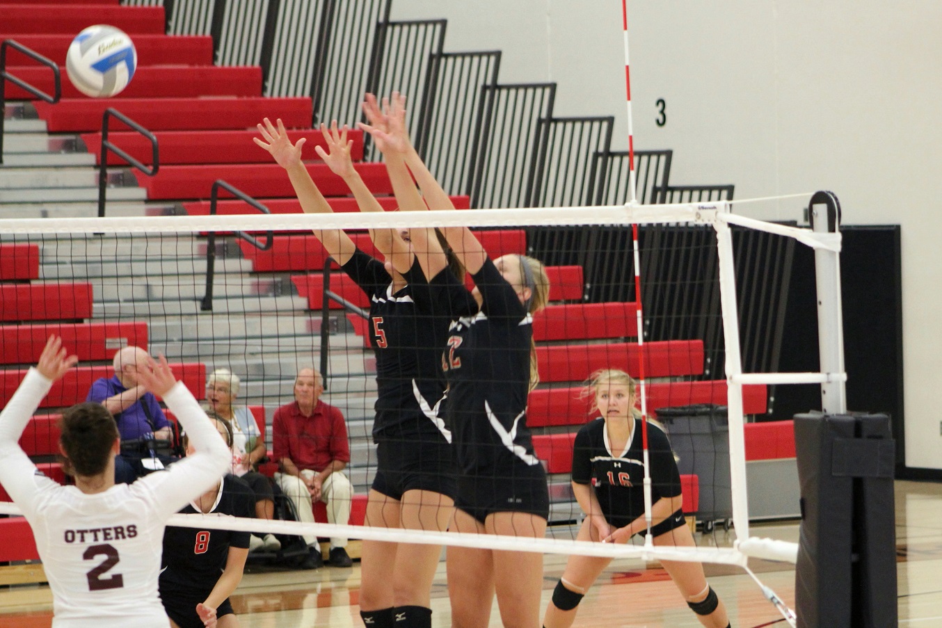 [Junior Jordyn Lamb (12) goes over the top of the Otter blockade.]