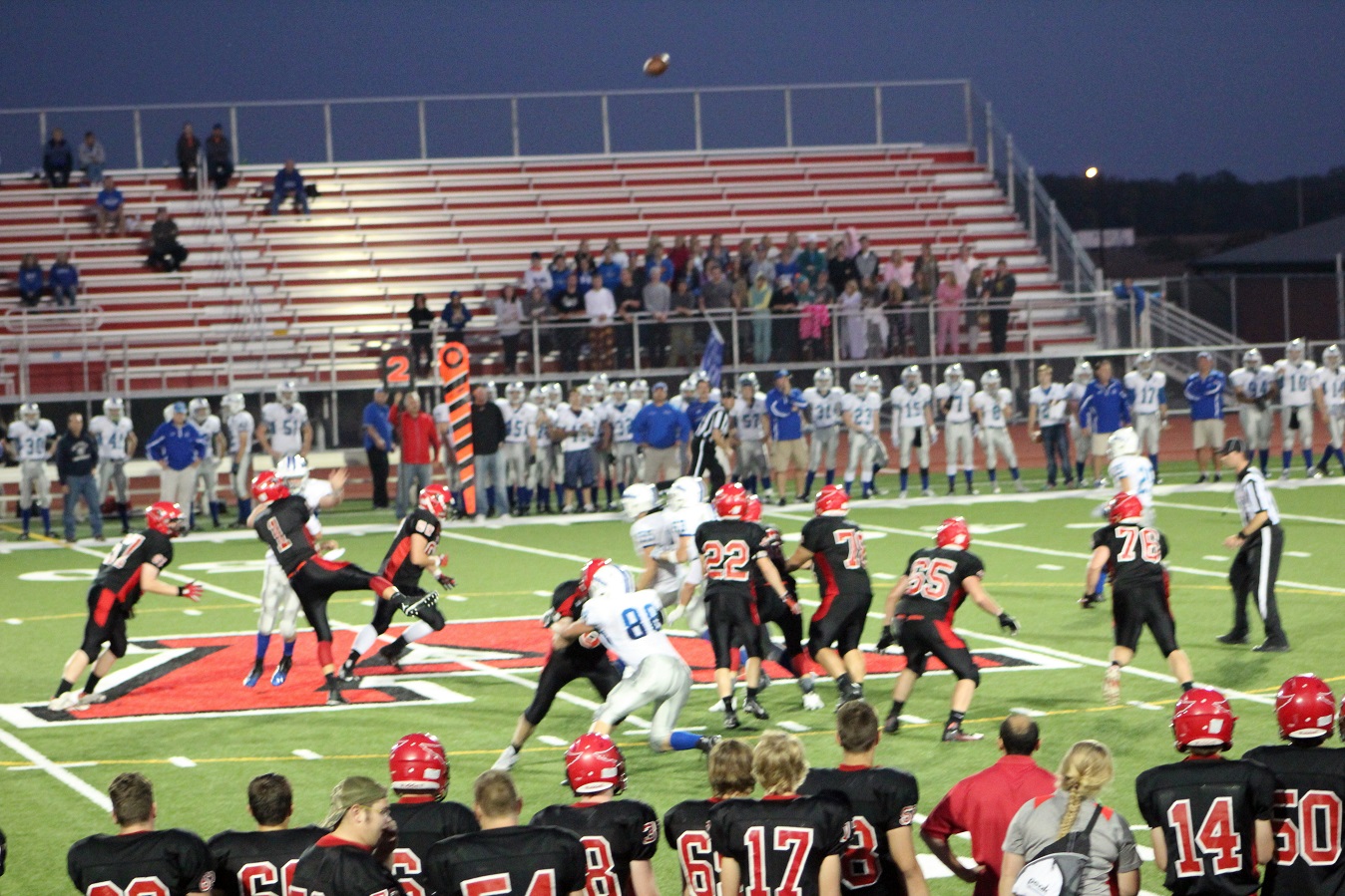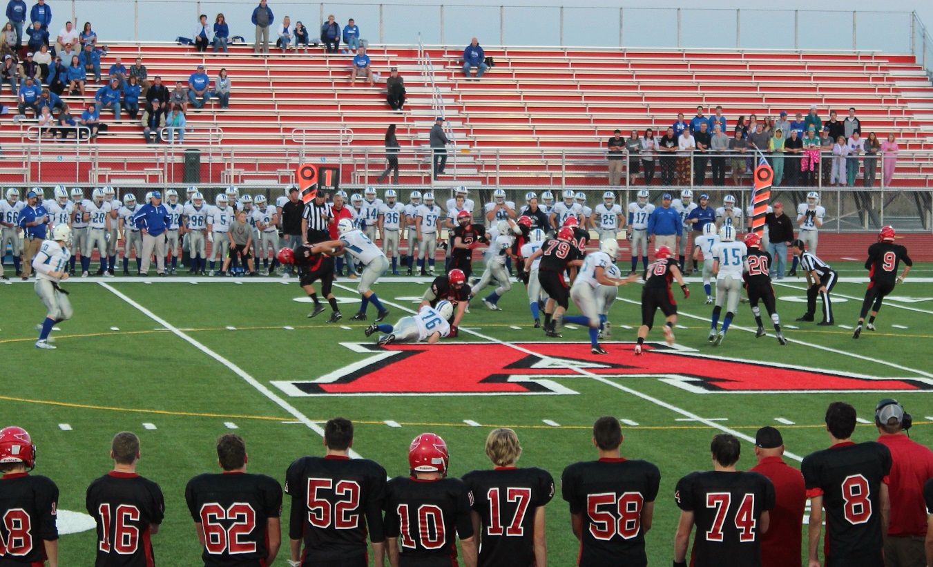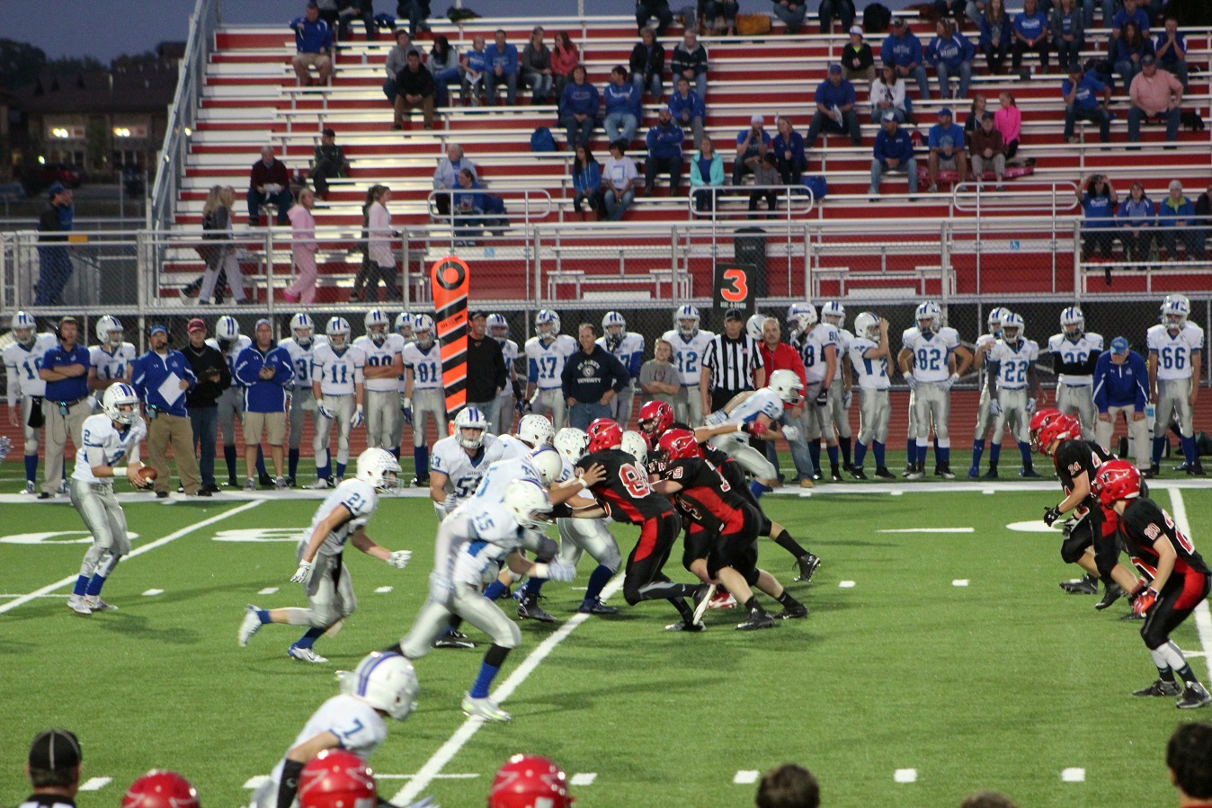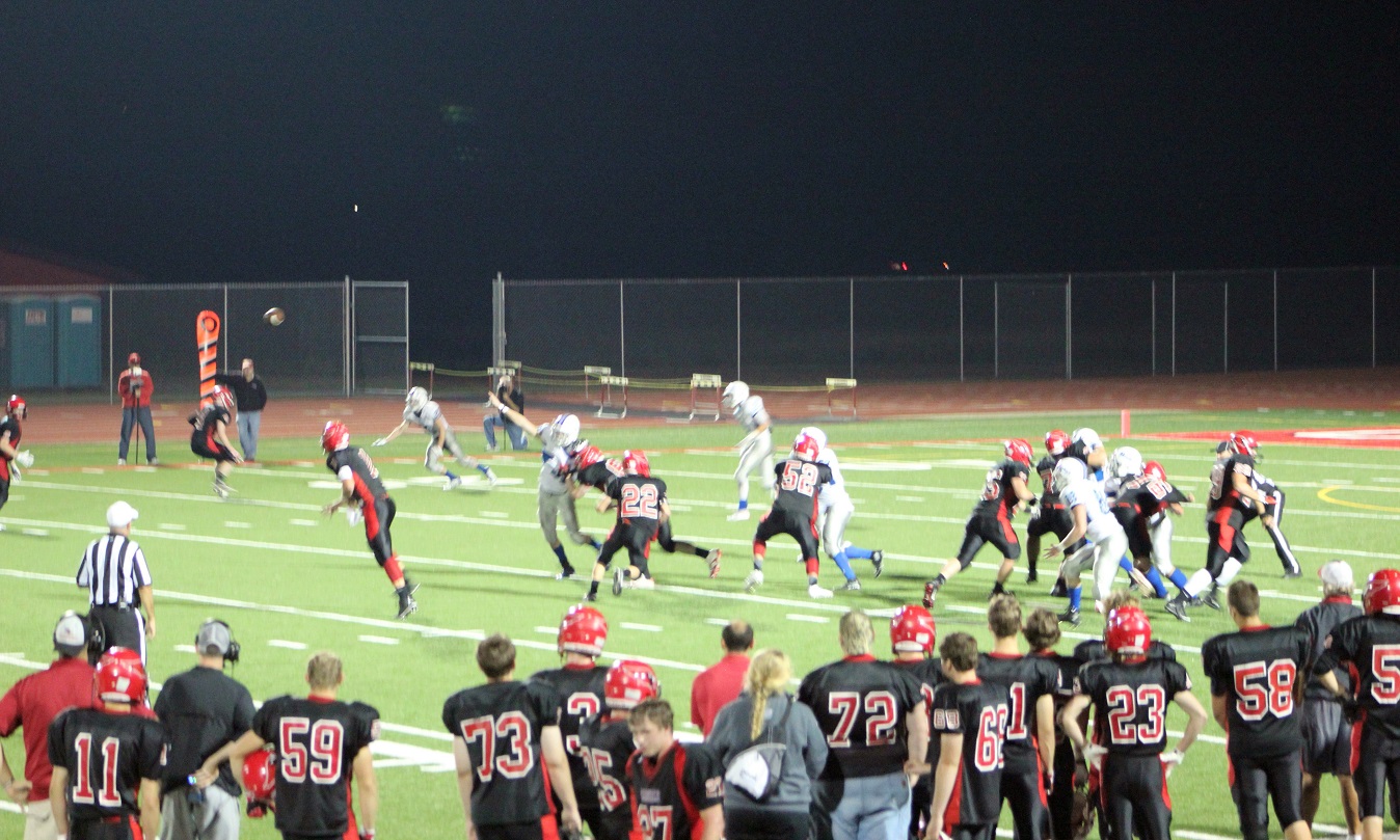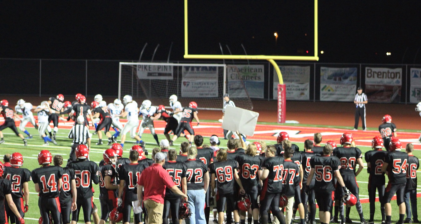 [Senior wide receiver Brayden Amundsen (7) got nicked late in the first half – appeared to be a high right ankle sprain. He did not play again. Senior wide receive Tom Whiting also got hurt and did not play in the 2nd half. I believe they have been our two top receivers, which may explain the emphasis on the running game. I hope they’re not out long?]