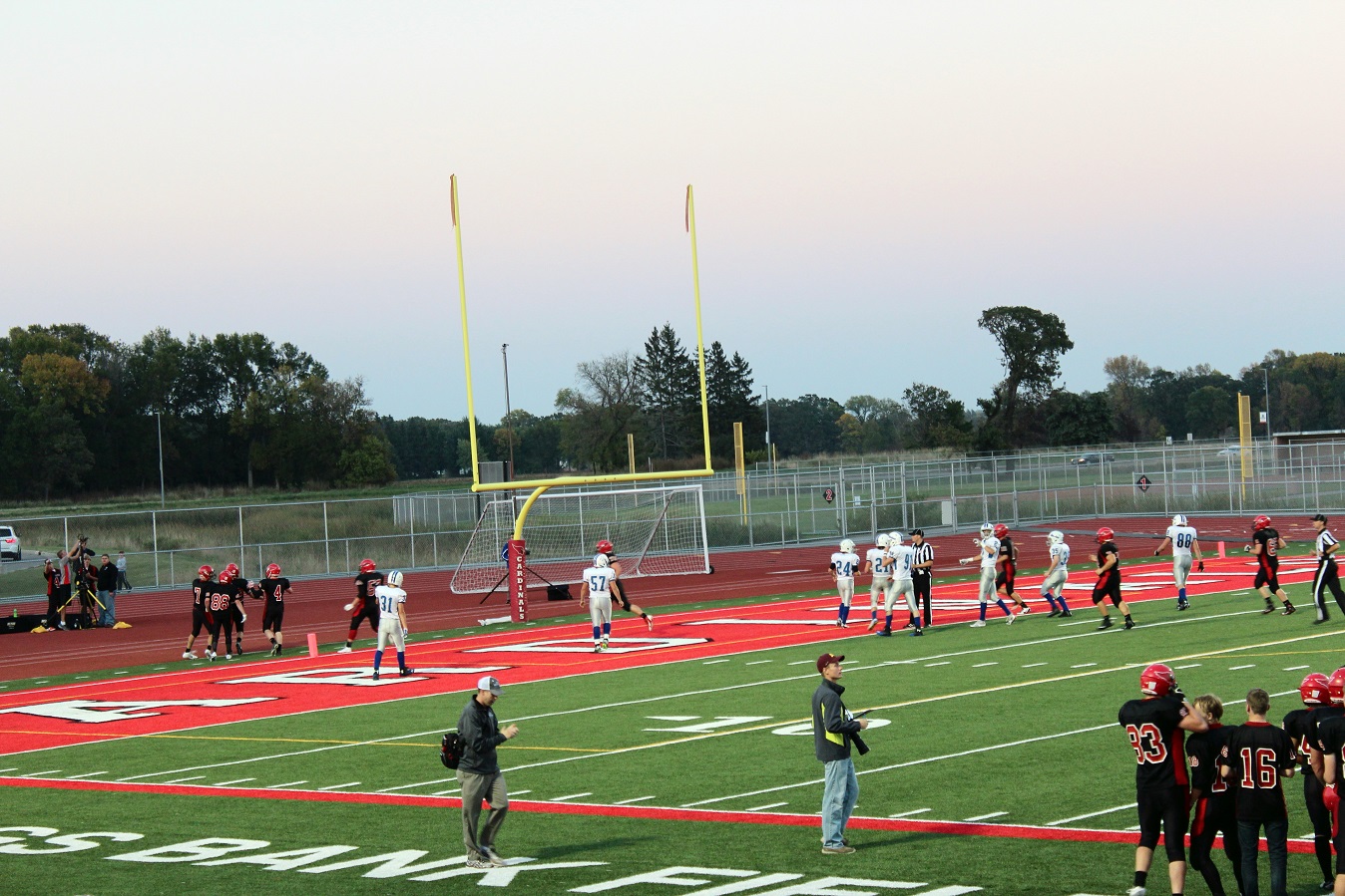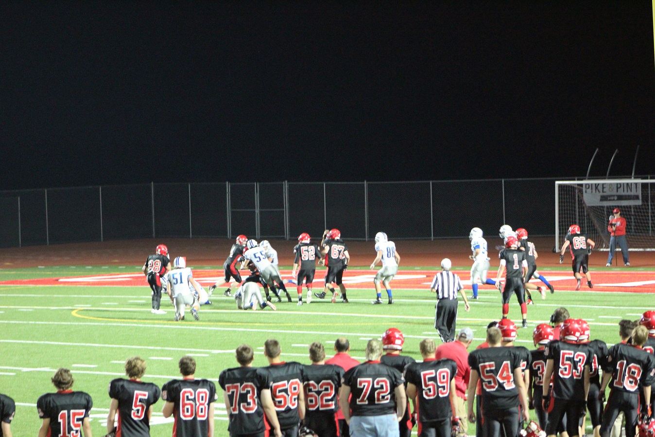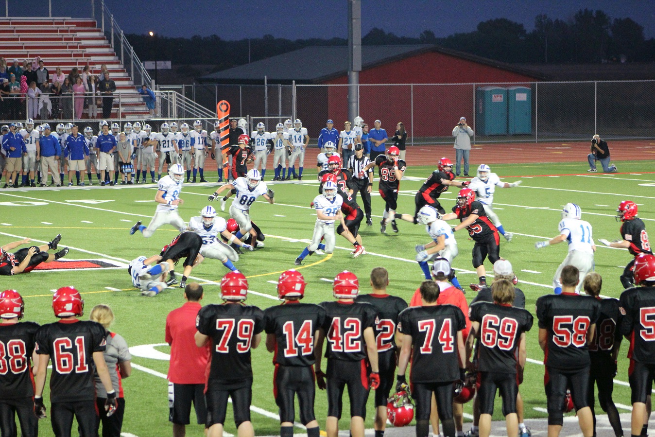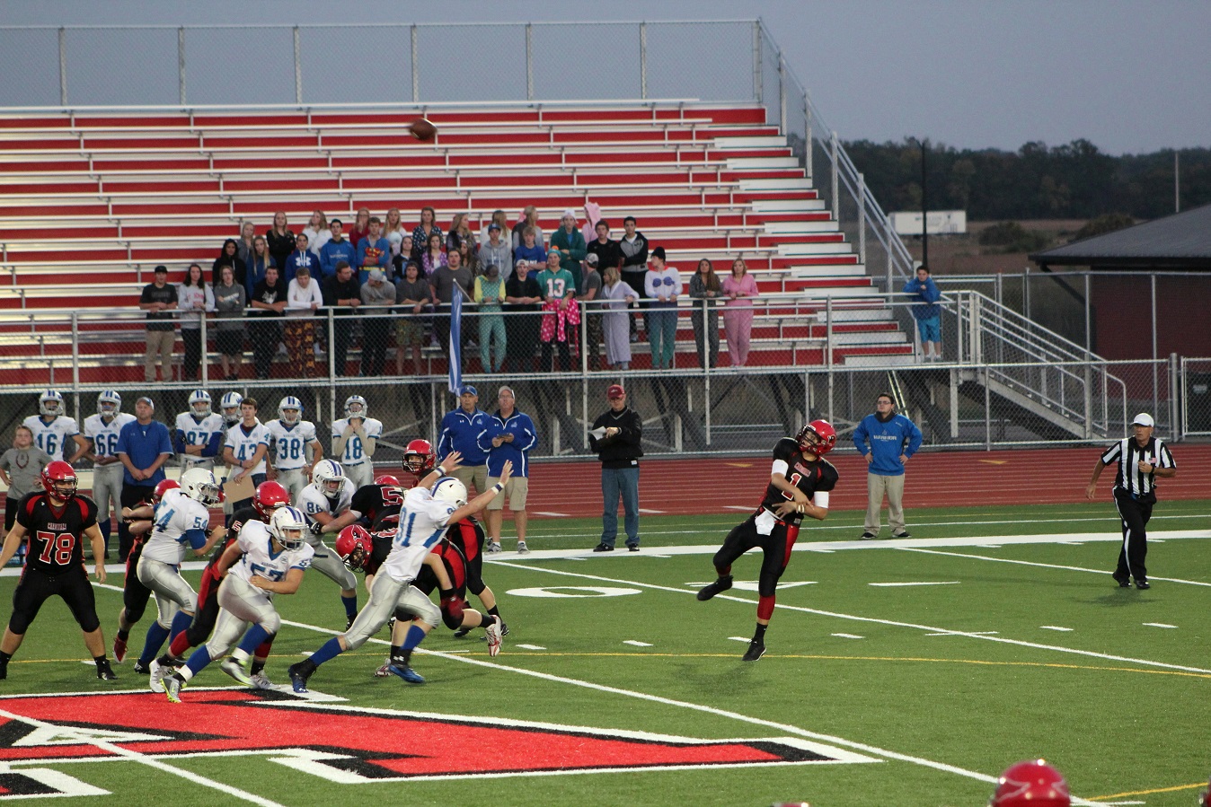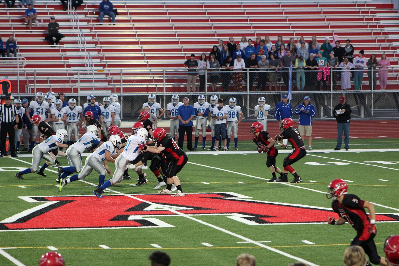 [Senior wide receiver Brayden Amundsen (7) got nicked late in the first half – appeared to be a high right ankle sprain. He did not play again. Senior wide receive Tom Whiting also got hurt and did not play in the 2nd half. I believe they have been our two top receivers, which may explain the emphasis on the running game. I hope they’re not out long?]