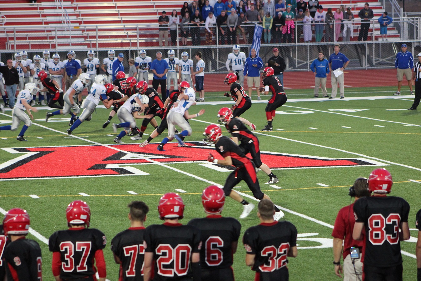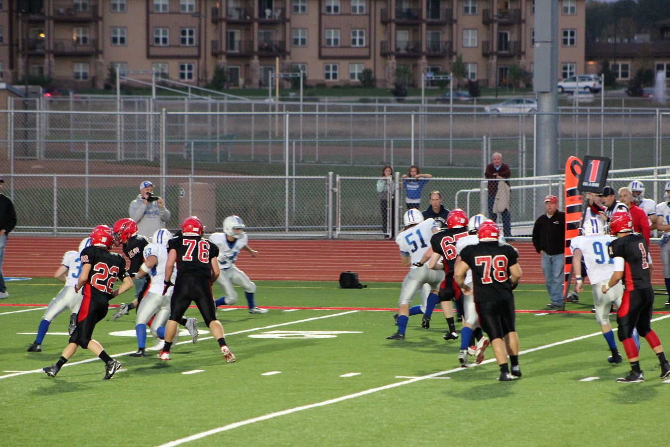 [The offense is every bit as exciting as advertised. These two young men, quarterback Jaran Roste (1) and halfback Micah Christenson (22), both juniors, put on a good show. Micah rushed for 180 yards and I believe 4 TD’s, and Jaran rushed for 130 yards and passed for 180 (18 – 24) – I think those are right? The sports photographer re-appeared in the background, a good sign for those of us who thought he may have been lost in the stampede.]