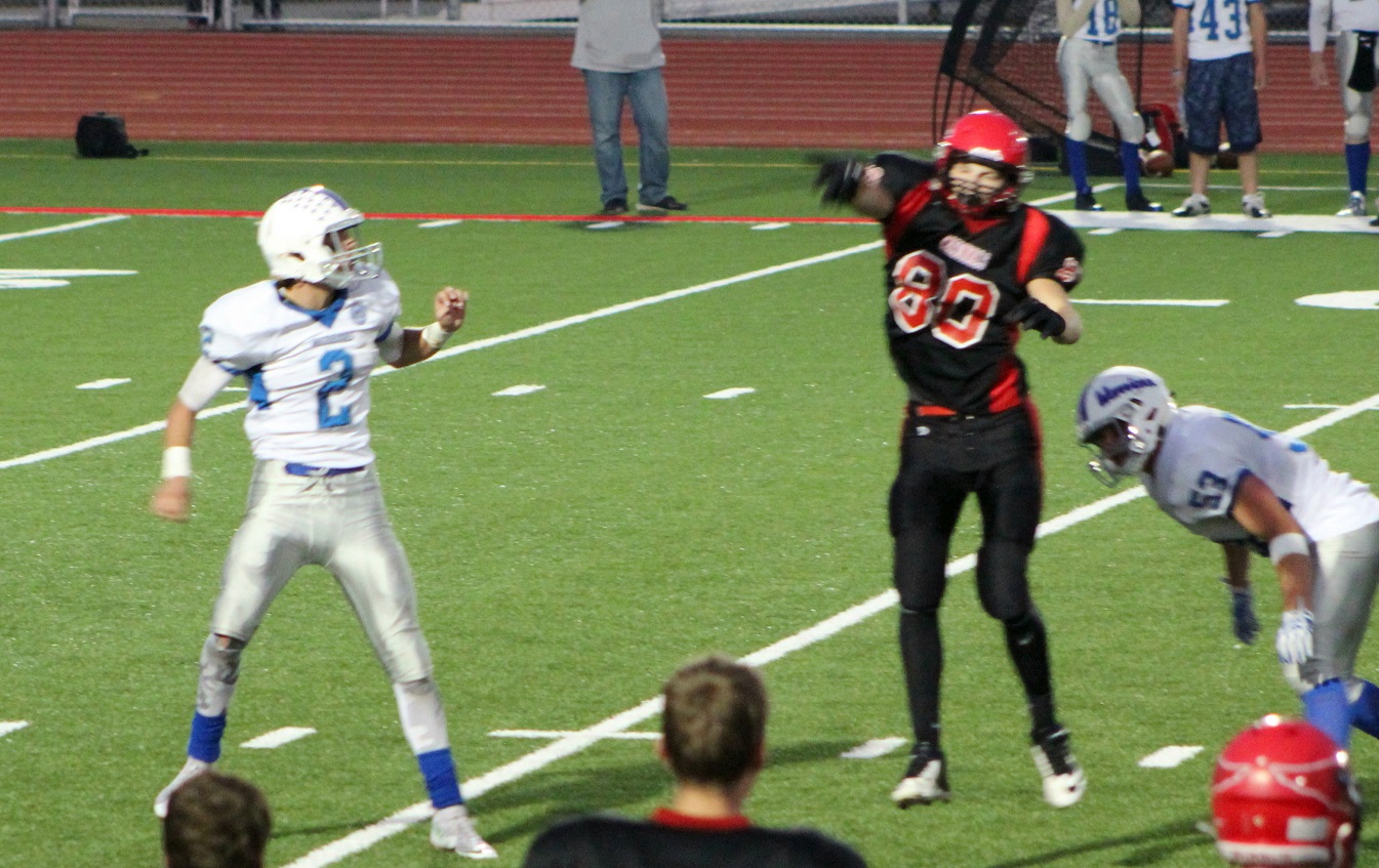 [Upon further review, it was determined that 6’5″ senior defensive end, Henry Wirtjes (80), did indeed deflect this pass attempt by the Warriors’ Chris Pederson (2), also tall, and who appeared to play every position.]