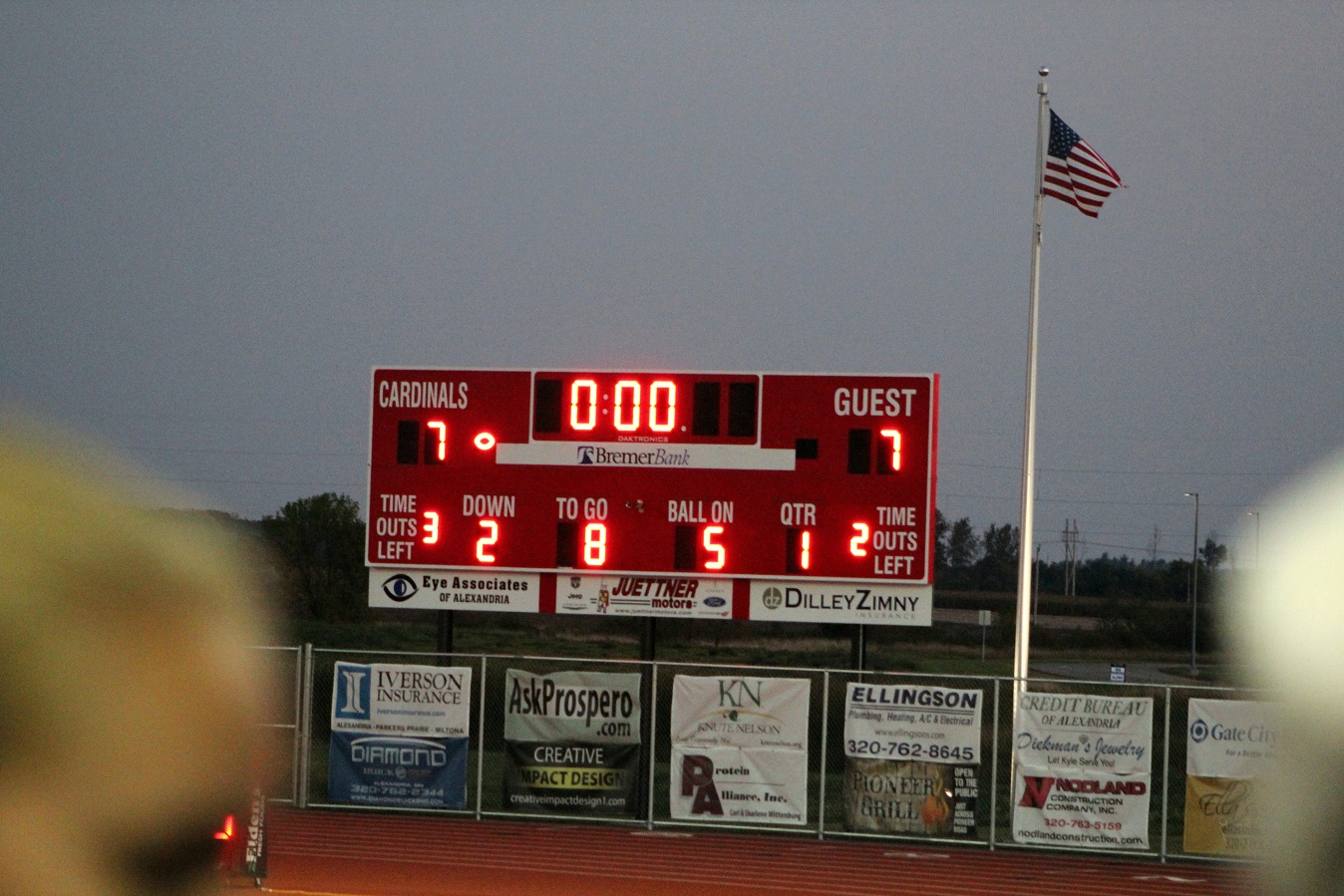 [This is a scoreboard. It shows us to be ahead by one at the half. The Cards scored with a little over a minute left, but that was enough time left for the Warriors to come back and put a TD on top of ours! Uffda! This is also a flag. It lets all the players know what country they’re in and from which direction the wind is blowing.]