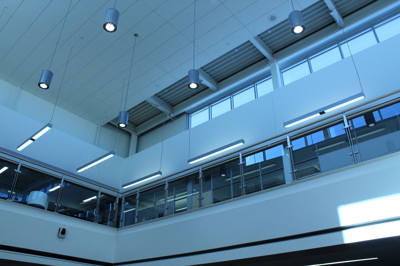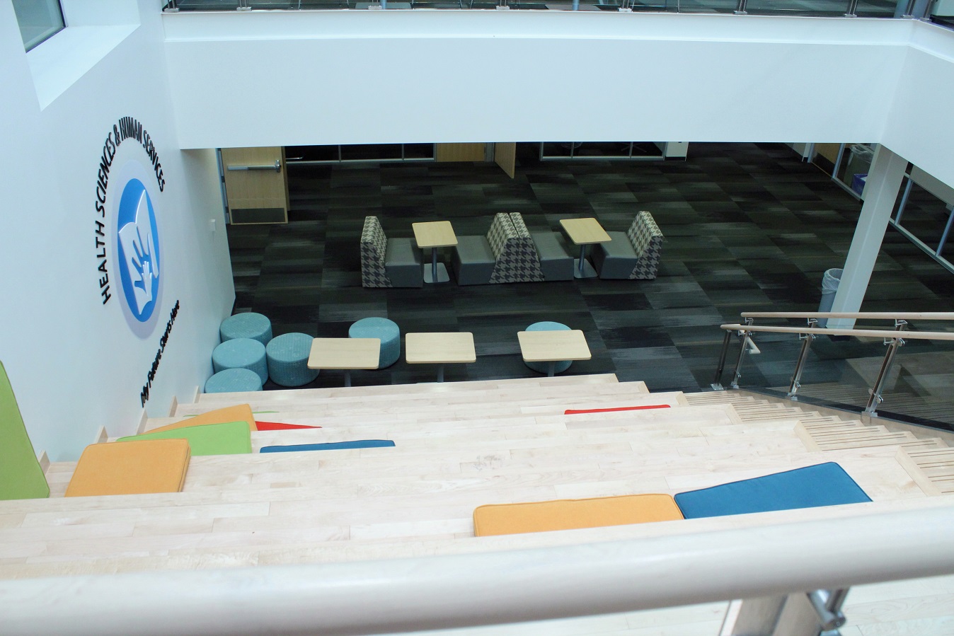 [Now down to the Common Area, past the wall of contributors. Many of the “extra features” of the school were made possible through private contributions.]