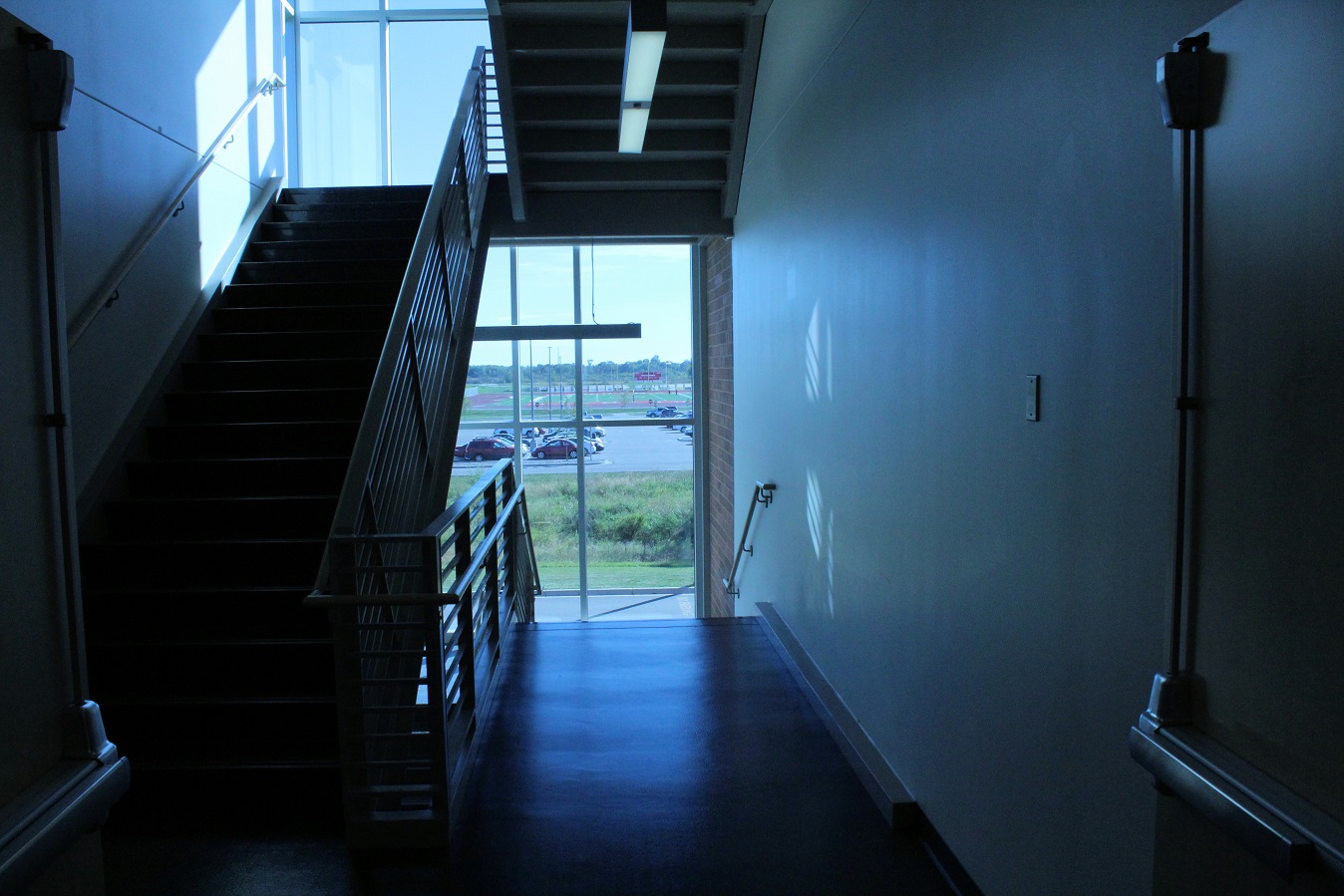 [The principal about to lead us from the common area, cleared for the homecoming dance, to the performing arts center . . . ]