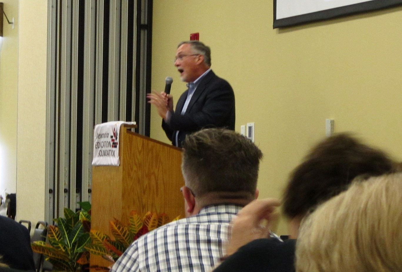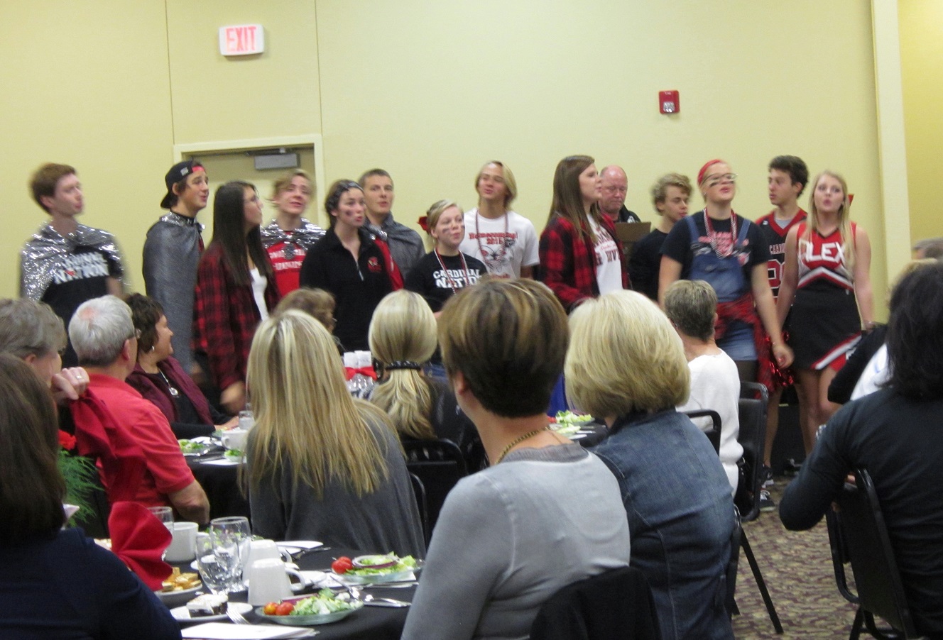 [Such a good crowd that Asst. Principal Wunderlich (left foreground) was ultimately joined by Principal Chad Duwenhoegger (left background, black shirt), the Minnesota principal-of-the-year.]