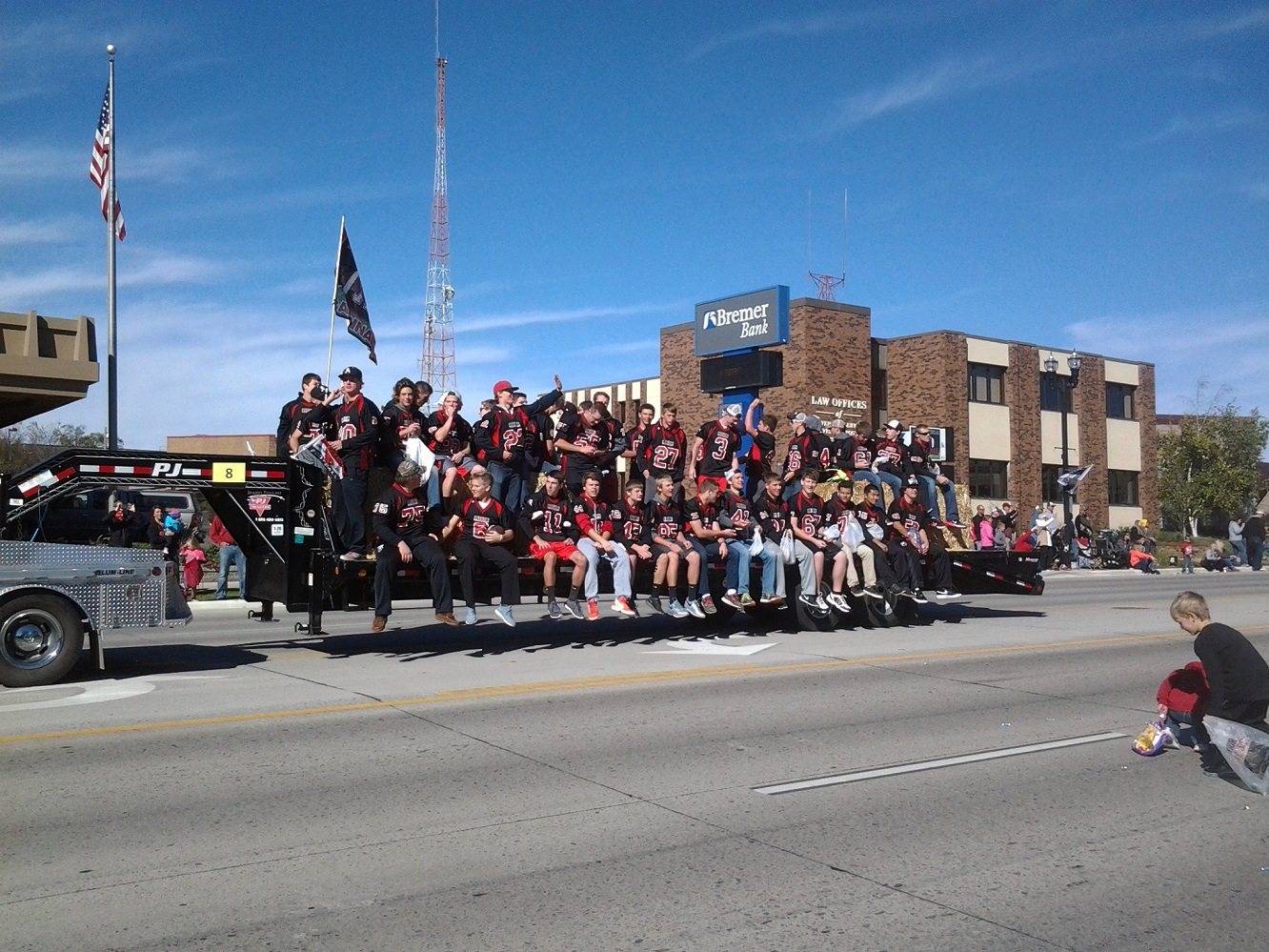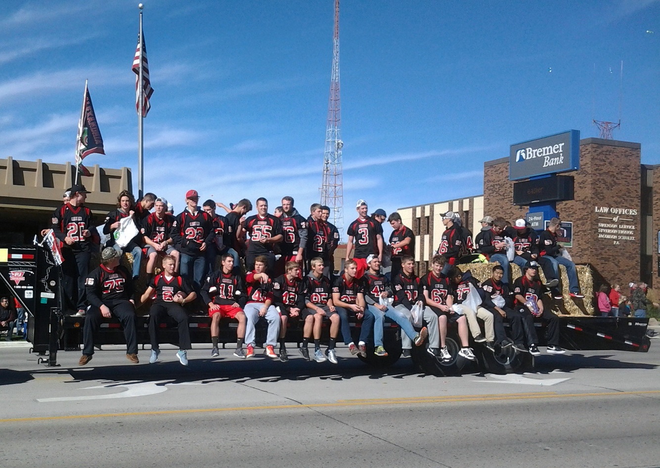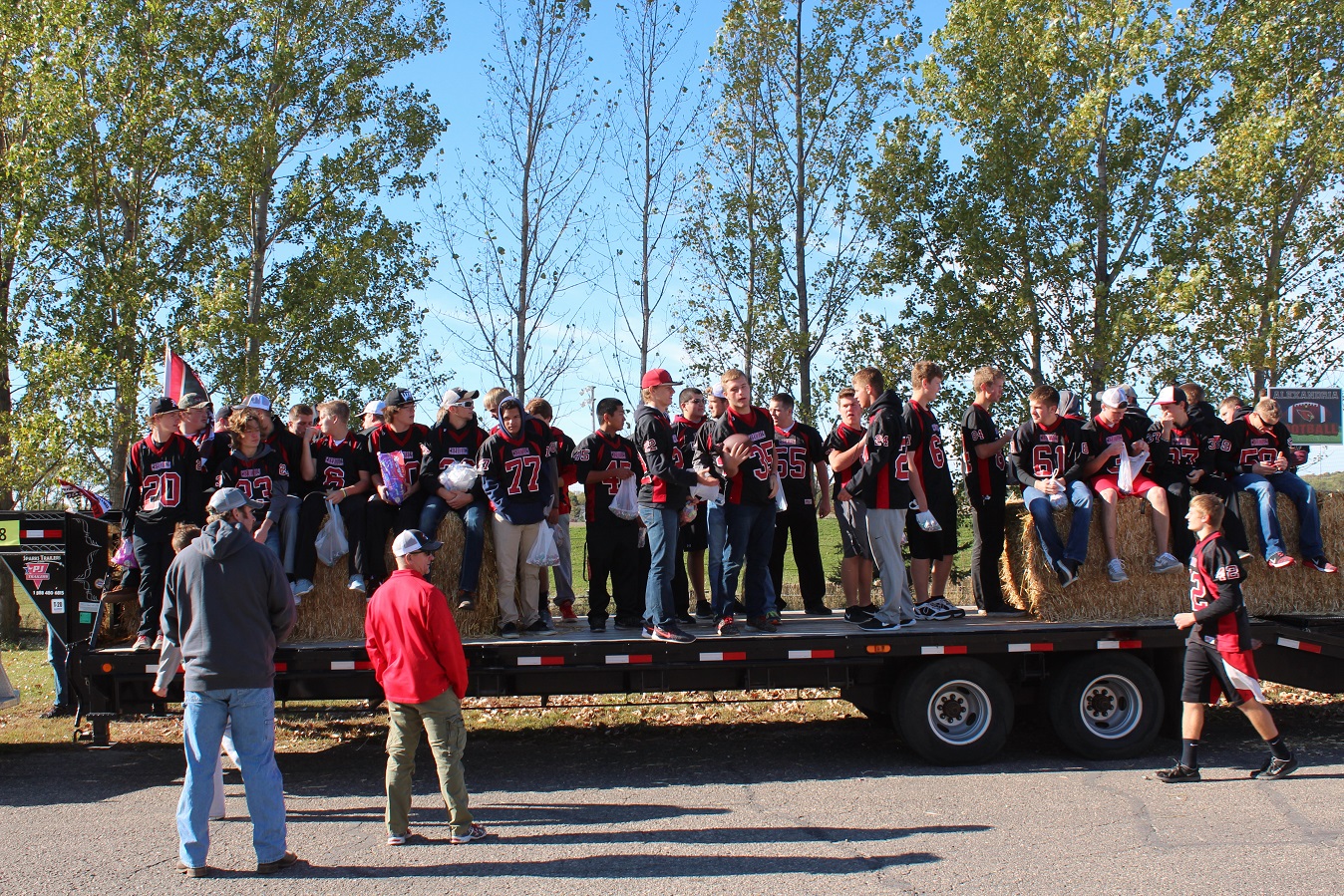 [Another beautiful crisp early fall day in Vacationland USA as we sauntered onto the fairgrounds to find our position in the Homecoming Parade.  Our first encounter was with the football team.]
