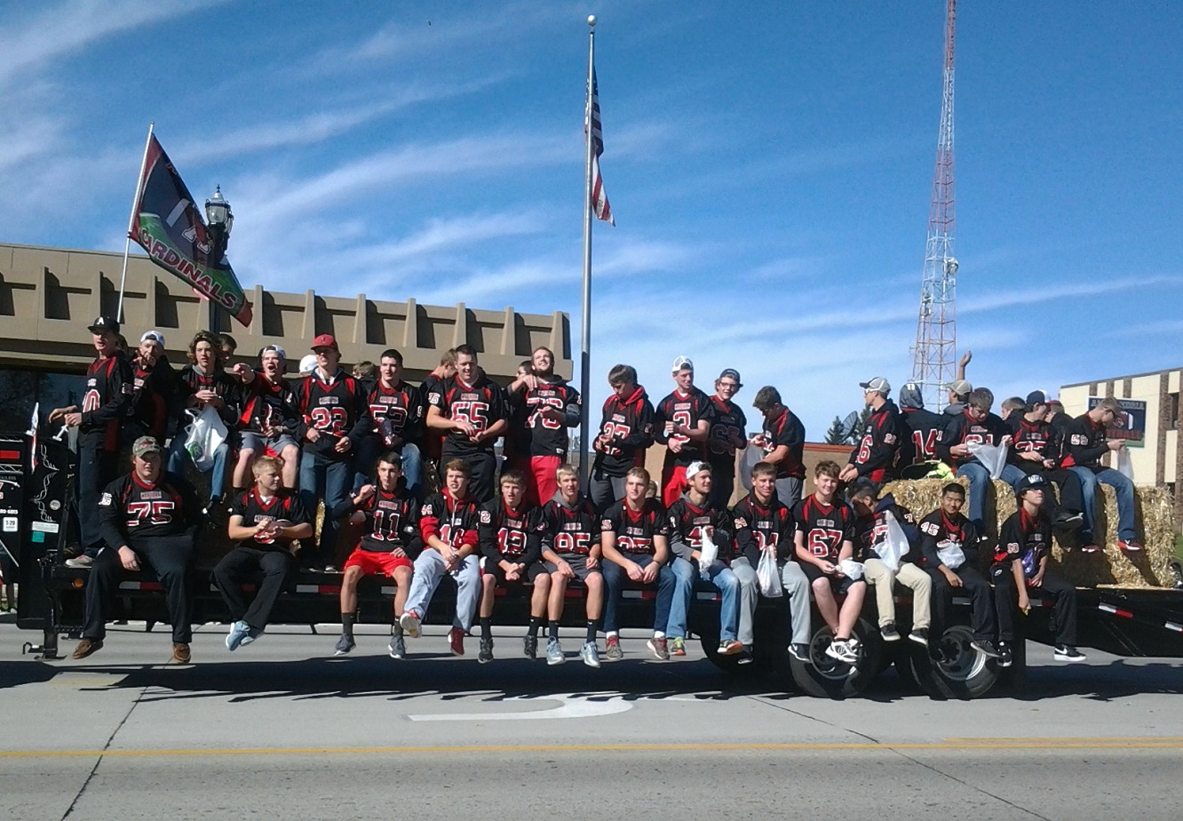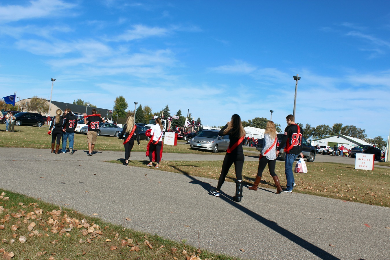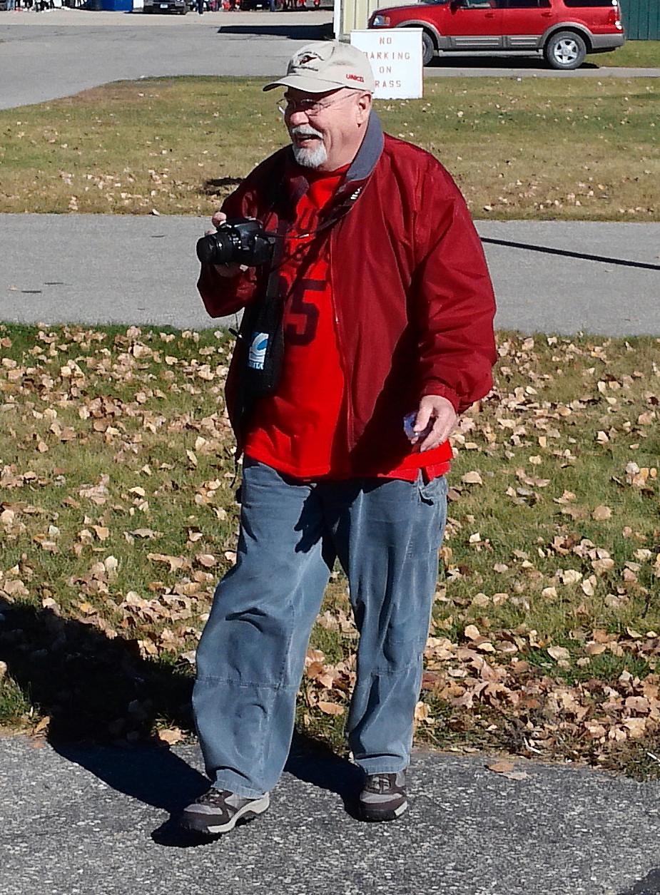 [Another beautiful crisp early fall day in Vacationland USA as we sauntered onto the fairgrounds to find our position in the Homecoming Parade.  Our first encounter was with the football team.]