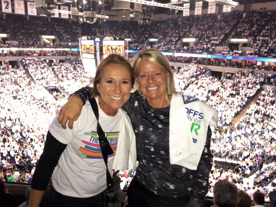 [Our Cardinal basketball coaches, Julie Wrobel and Wendy Kohler, were caught at the championship game for the Minnesota Lynx. Ostensibly, they were there to learn how to celebrate when our team makes state this year – their daughters, Macy and Kendall, respectively, are the starting guards. There was also a rumor they were there to recruit, but I’m sure they are aware Maya Moore’s high school eligibility has lapsed?]