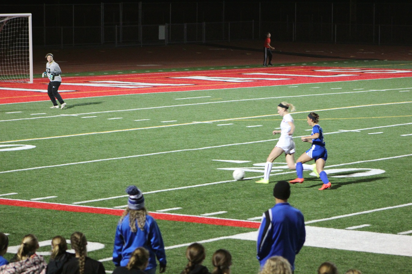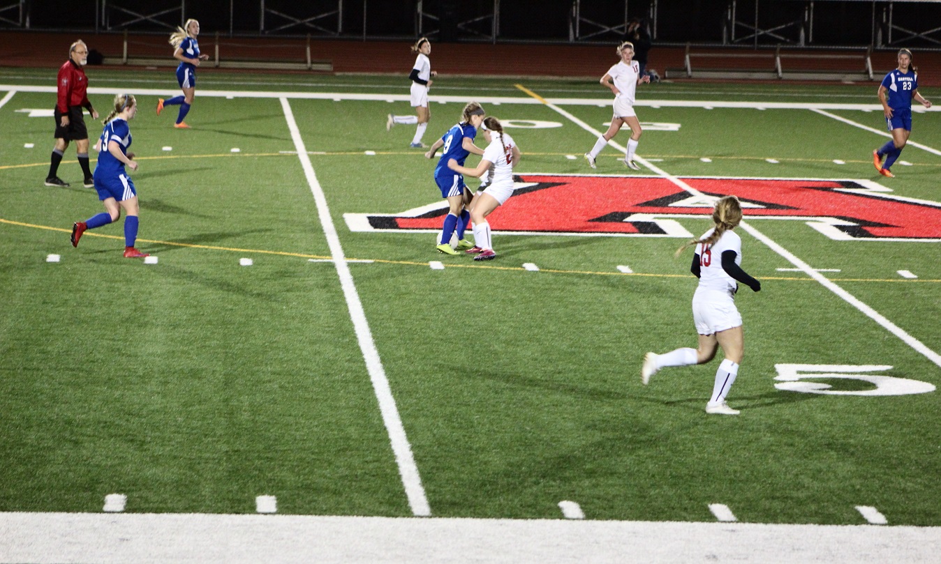 [Senior midfielder Sonja Johnson (17), who had a strong game, pooching it over to freshman Kaye Paschka (2).]