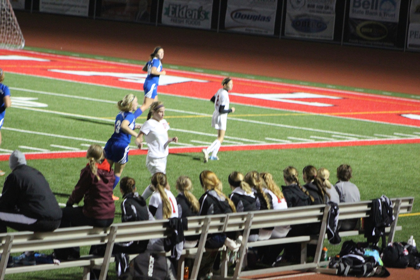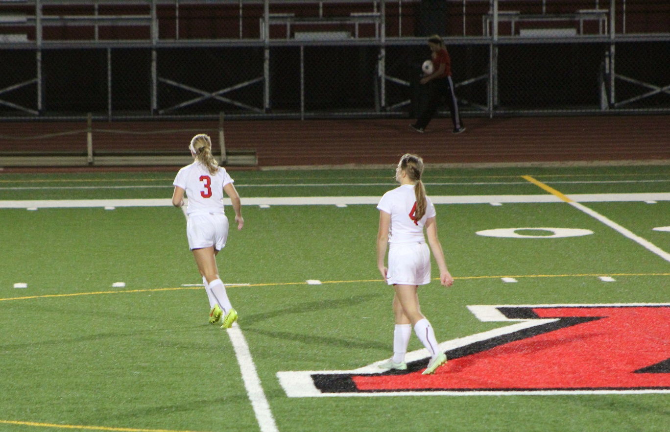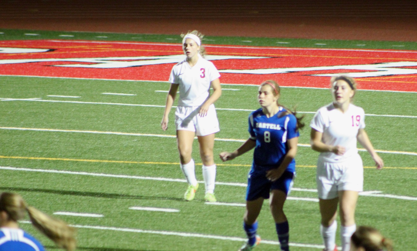 [In the first half, the Cardinals would be going from South to North at Viking Savings Bank Field. And here we have junior defense Kendall Kohler (3), whose mom and basketball coach was sitting adjacent to us, and senior defense Laura Dahlquist (19).]