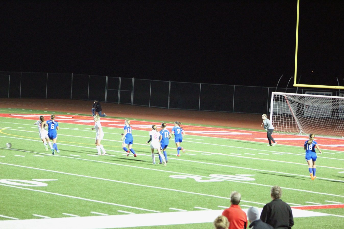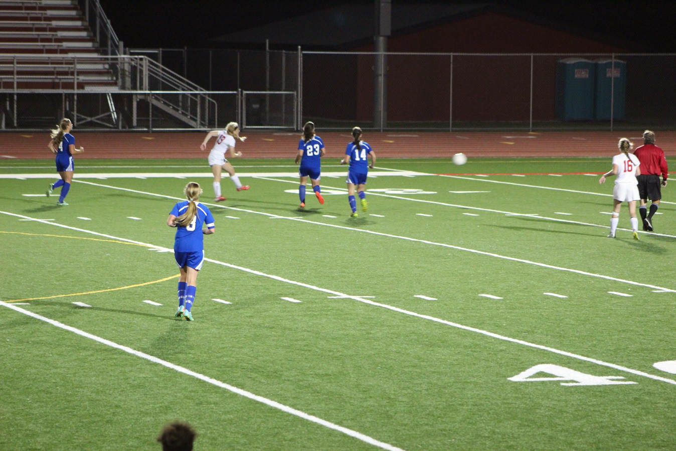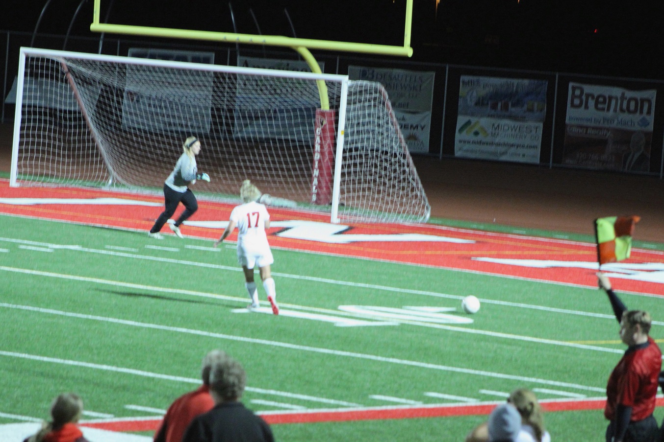 [In the first half, the Cardinals would be going from South to North at Viking Savings Bank Field. And here we have junior defense Kendall Kohler (3), whose mom and basketball coach was sitting adjacent to us, and senior defense Laura Dahlquist (19).]