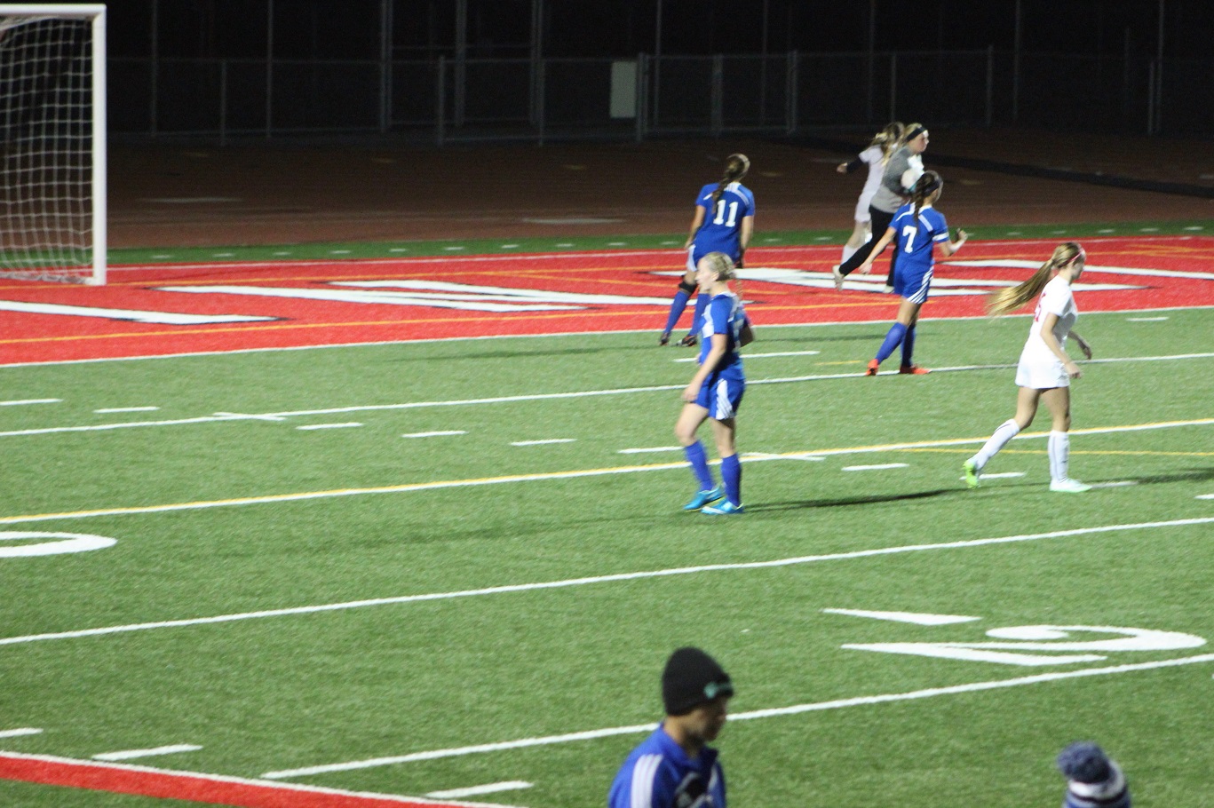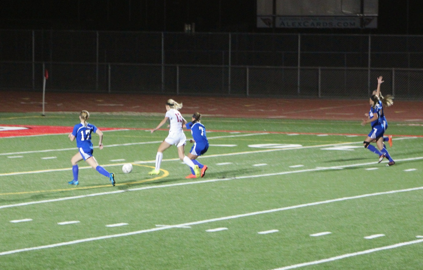 [Defend, defend, defend! L-r, senior forward Hanah Hanson (15), junior midfielder McKenna Smith (16), senior midfielder Karsen Granning (9), and Kaye.]