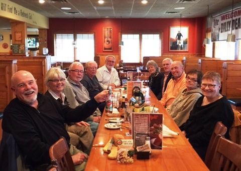 [The Class of ’65, forever noshing and imbibing, toast the Cardinals winter sports season (Bev Korkowski will admit to taking this photo). Found this interesting from Bev, not a single classmate from Florida: “We have classmates in the following states: TN-2, AZ-9, NY-2, WA-4, IN-3, OR-2, CA-4, OK-4, MI-1, CO-1, NC-1, KY-1, TX-6, NM-1, IL-1, MO-1, WI-7, AR-1, VA-1, KS-2, NE-2, and MT-2. Of course, we have lots of Minnesota people….121! And of those, 61 claim Alexandria as their address.”]