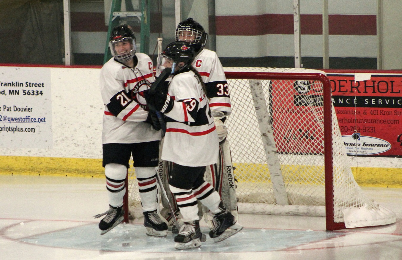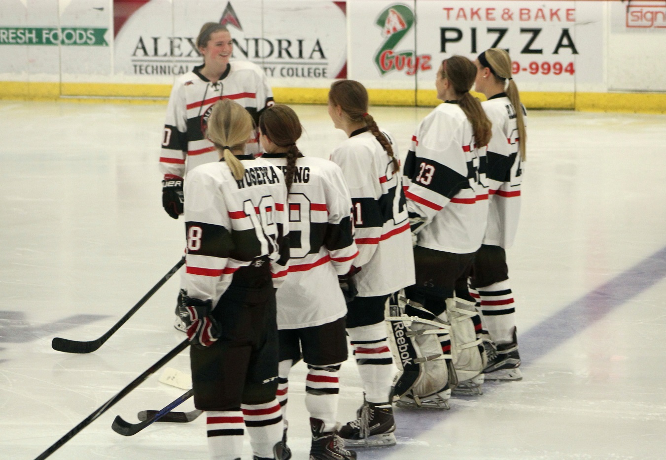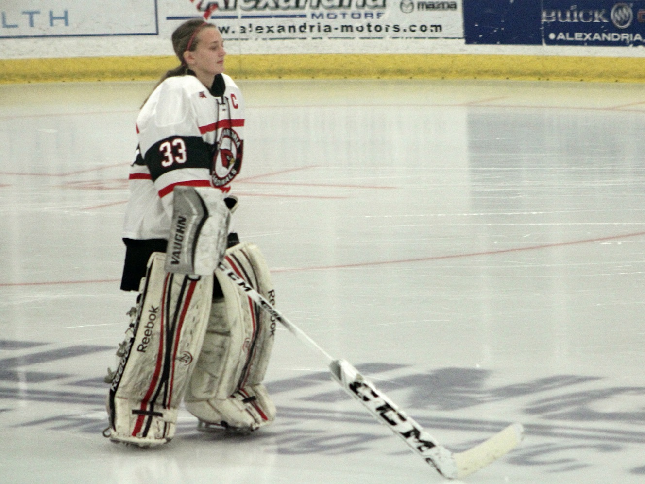 Alexandria junior McKenzie Revering (left) and senior Lauren Niska wear their University of Minnesota-Duluth gear on the ice at the Runestone Community Center on October 15. Both players recently gave verbal commitments to play their college hockey for the Bulldogs.