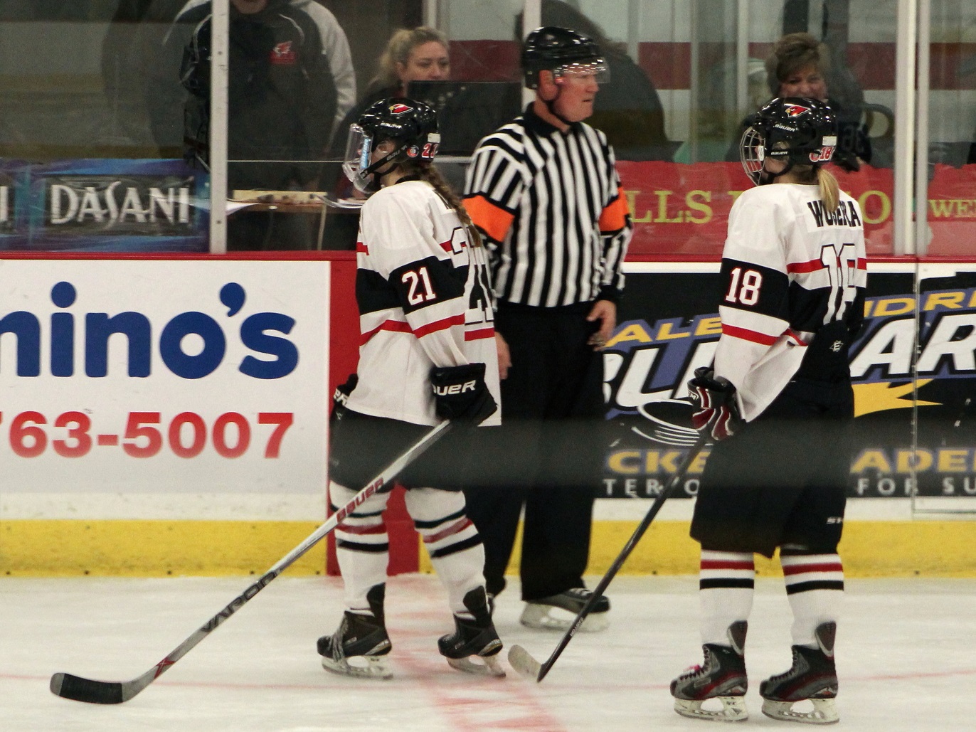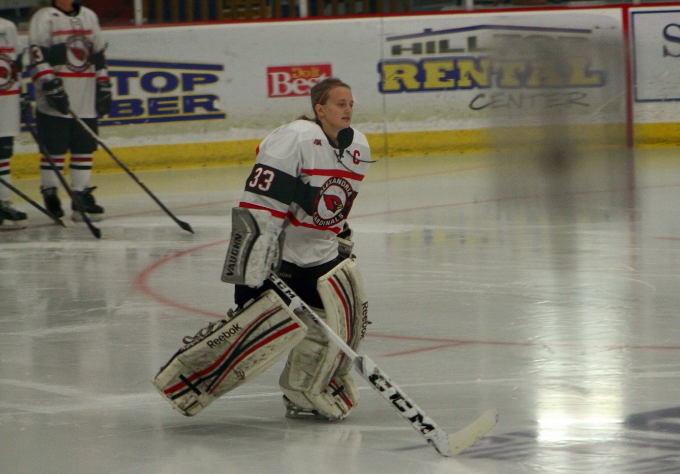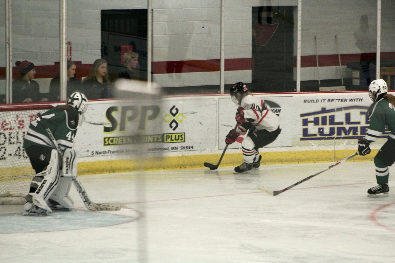 Alexandria junior McKenzie Revering (left) and senior Lauren Niska wear their University of Minnesota-Duluth gear on the ice at the Runestone Community Center on October 15. Both players recently gave verbal commitments to play their college hockey for the Bulldogs.