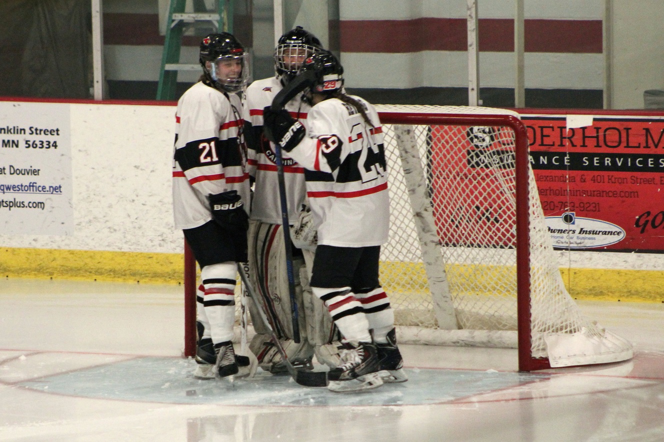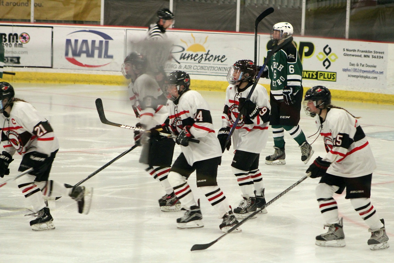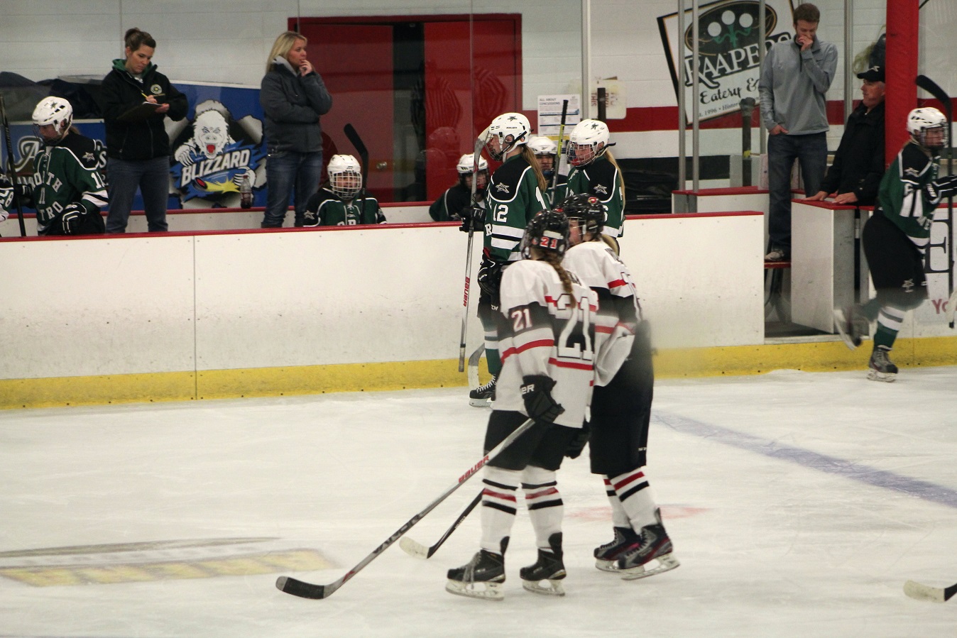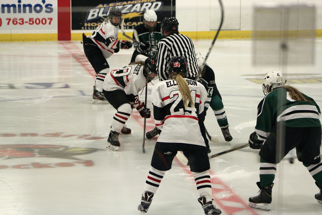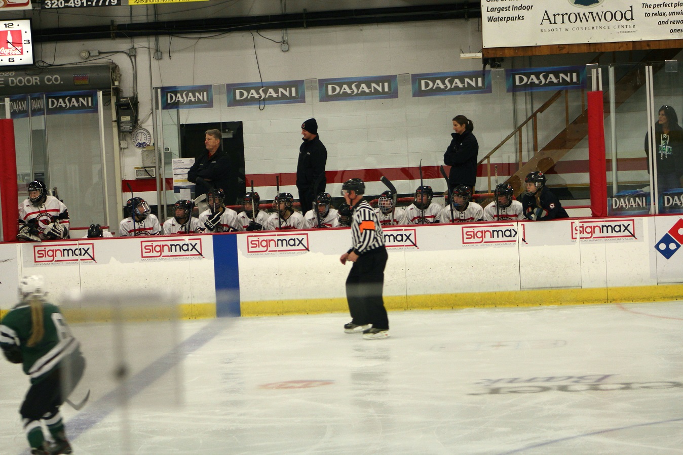[This is an experienced team, with even the frosh and sophomores already having varsity experience. But we did notice . . . well, it looks like the JV roster is from last year? We know Onna O’Connor has decided to hang up her skates after a couple of knee surgeries, and there were a few players on both rosters who are not listed at all? North Metro has been a regular team on our schedule for the last few years, composed of players from Fridley, Osseo, Park Center, but even a Star fan sitting in front of us couldn’t name what other schools are involved? We have schedule full of Class AA teams which should prepare us well for tournament time.]