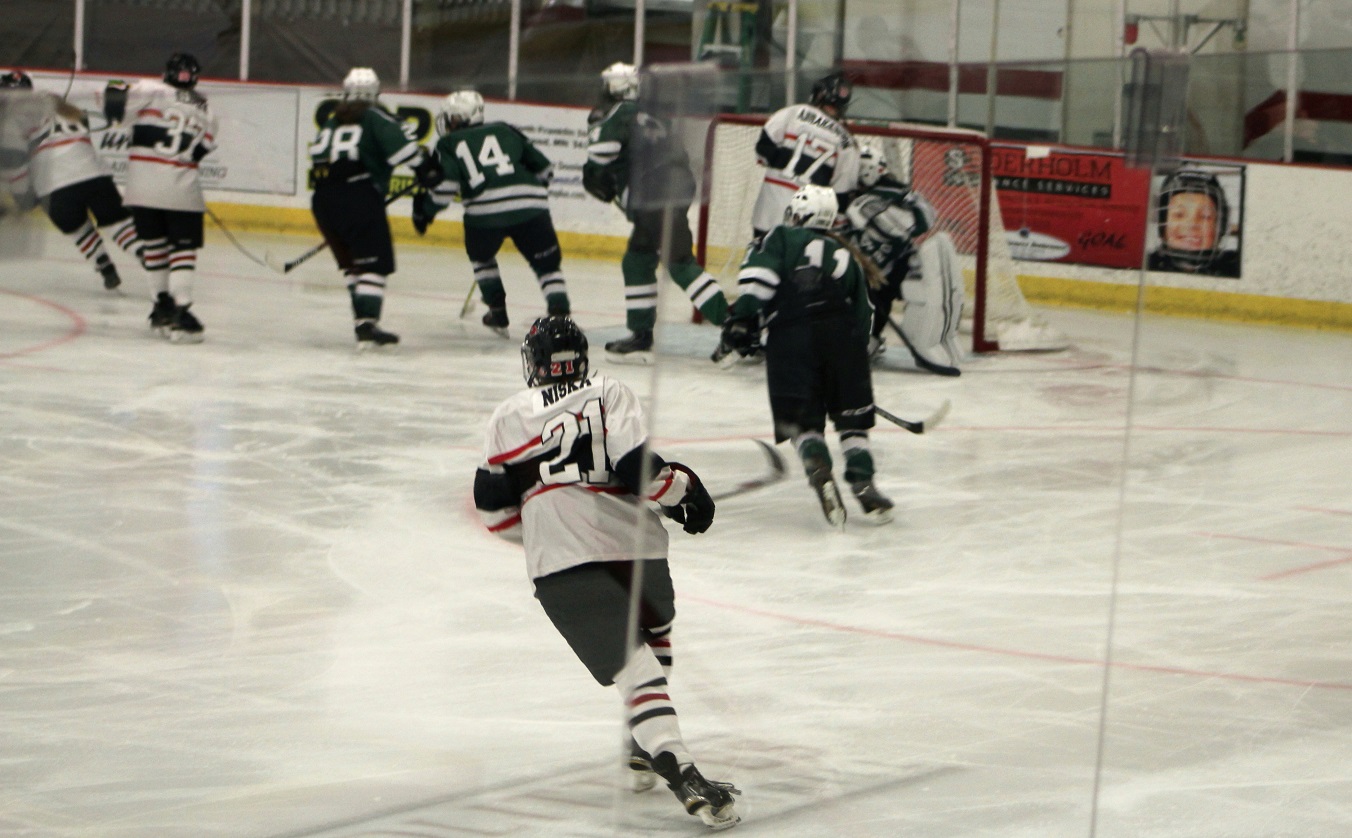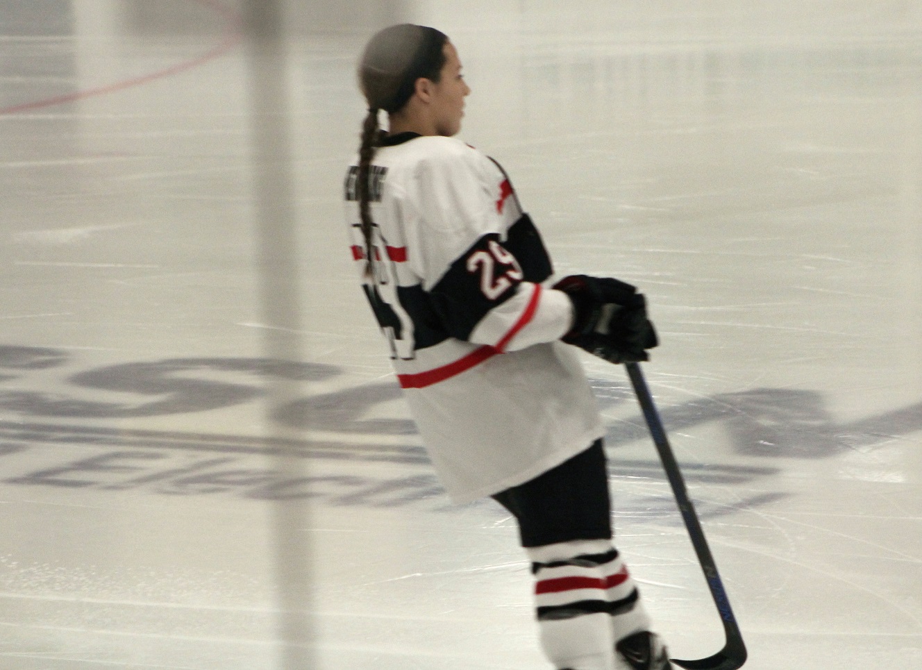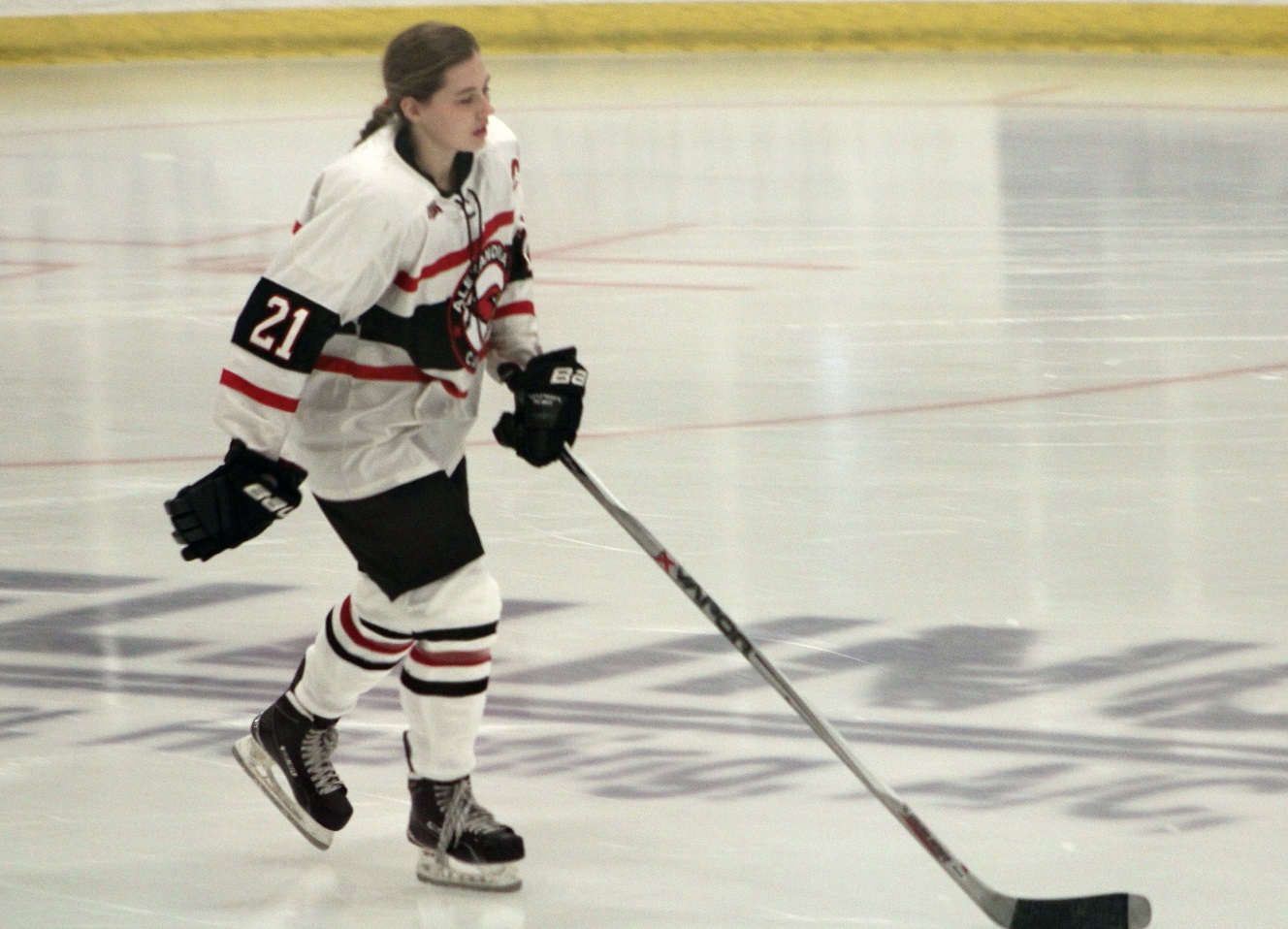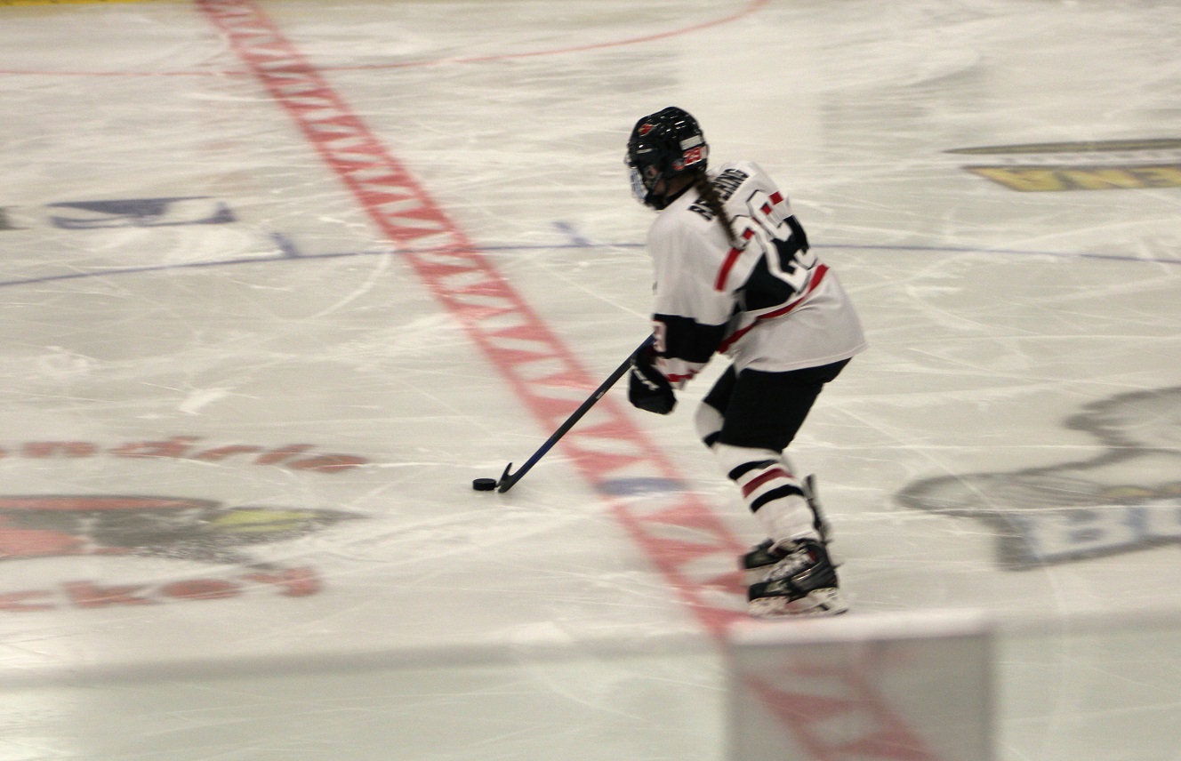 [Karina on the offensive. All our defenseman are offensively minded, so we do get caught by odd man rushes. Considered a price worth paying with Amy in the net.]