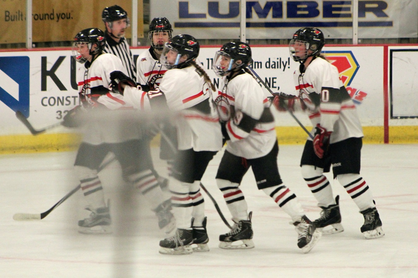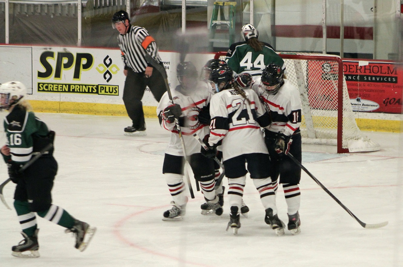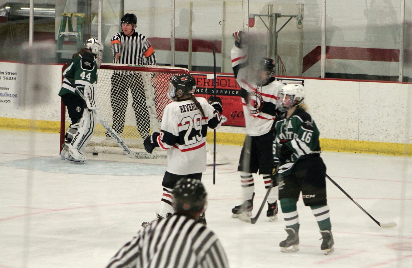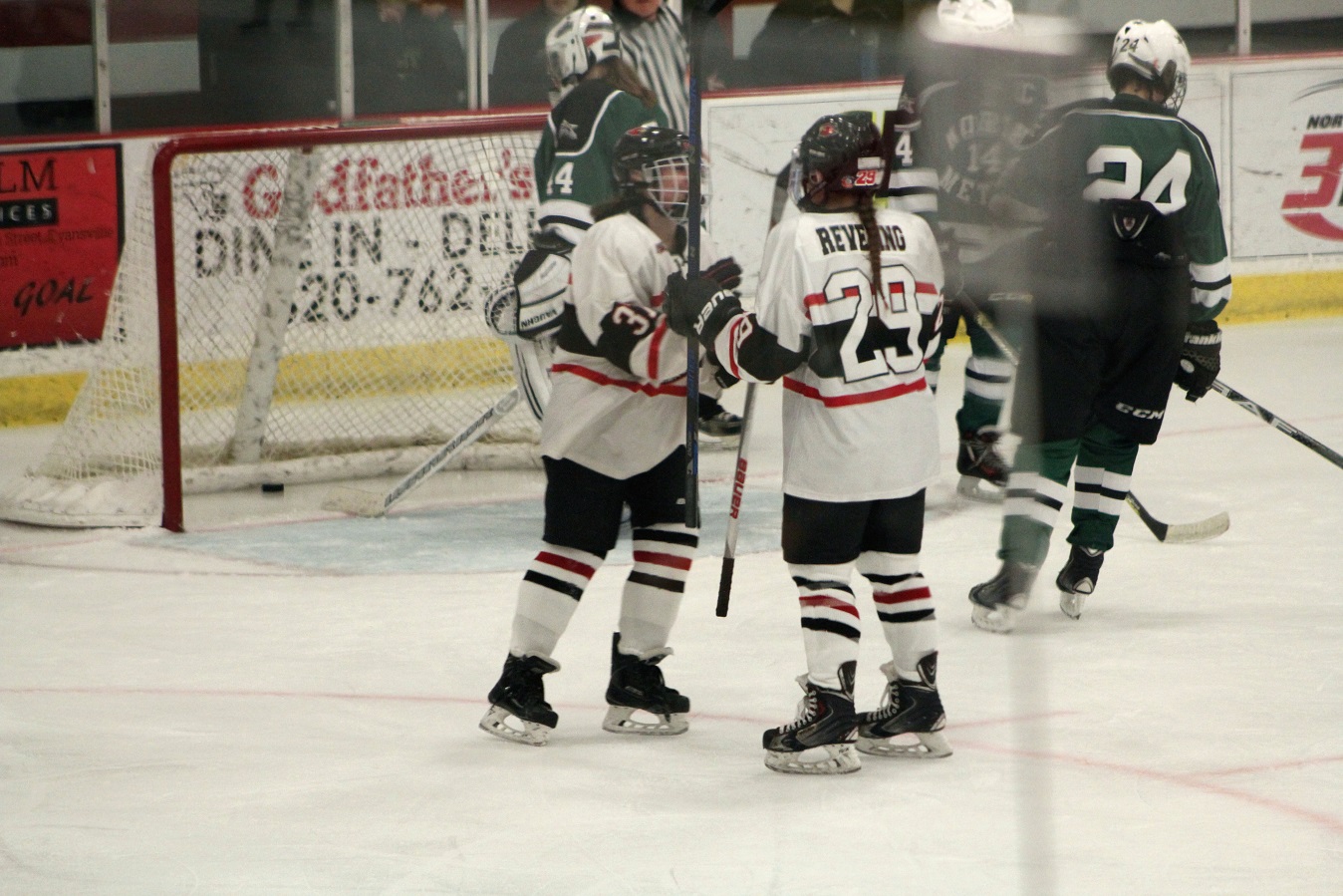 [And soon Sam Klimek (37), senior forward, is thanking Rev for an assist on her goal.]
