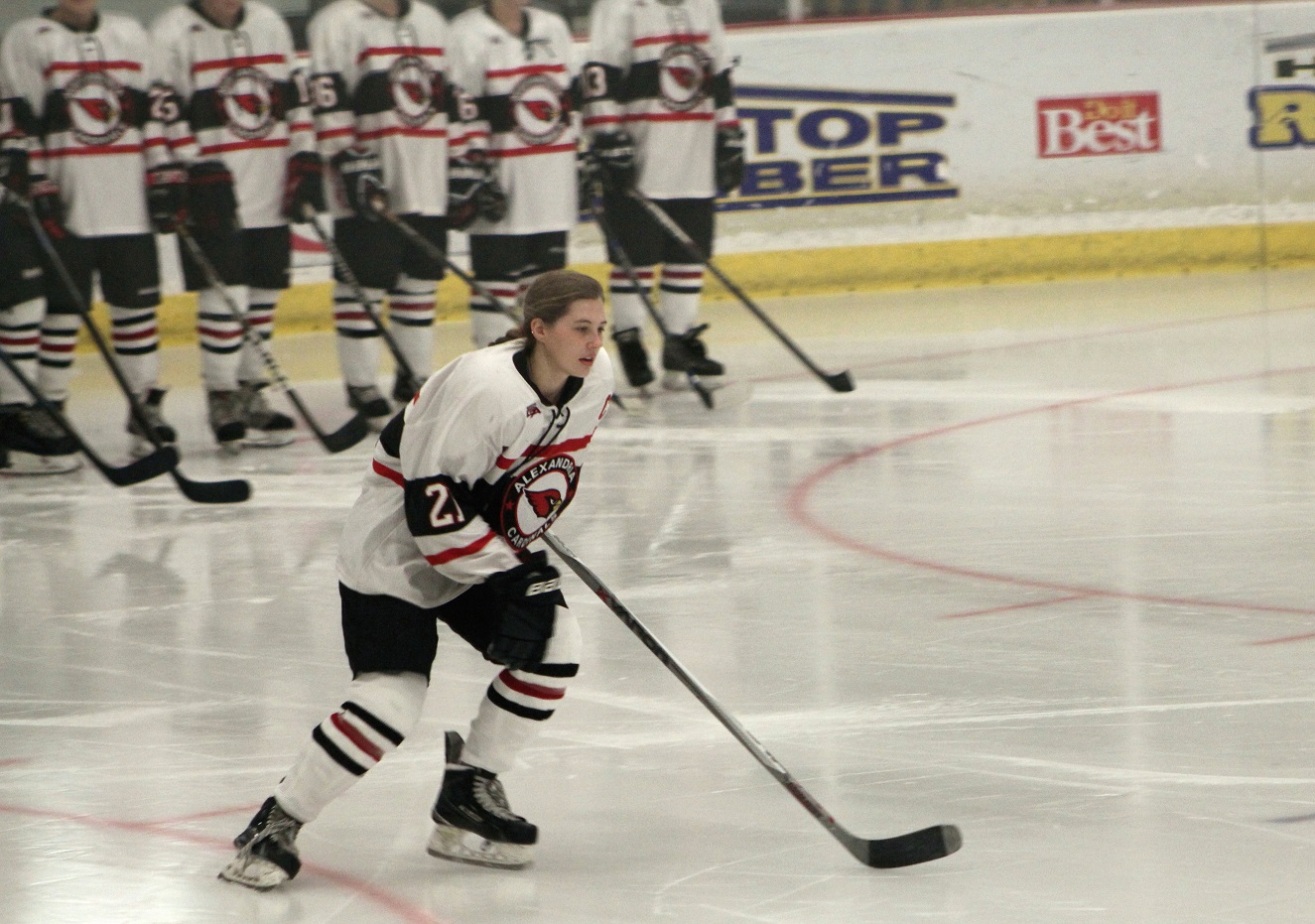 [Mari Wosepka (18), senior forward, and sings the Anthem in the absence of Roger.]