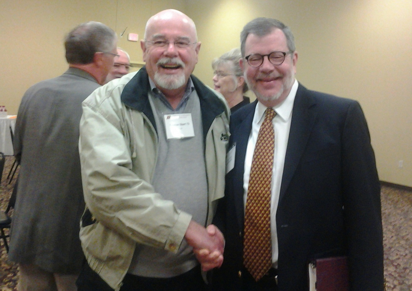 [Earlier in the week, University of Minnesota President Eric Kaler expresses gratitude to a local alum for Bethany and Megan Hasz becoming future Gophers.]