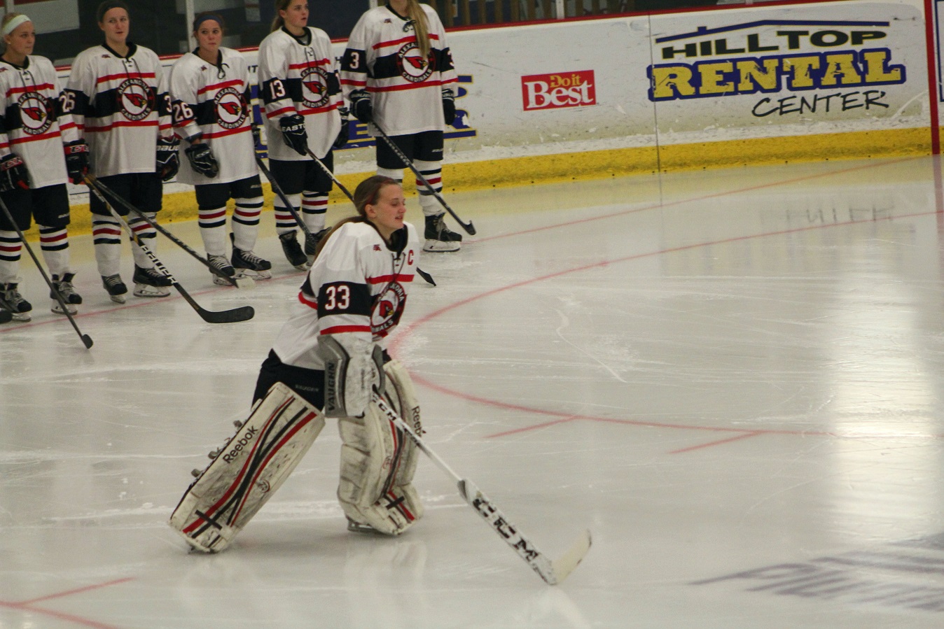 [Rev wrapped it up. She tried a slap shot that deflected back to her, so she stick handled in a little closer and rifled a wrist shot over the goalie’s shoulder. Assists to Abrahamson and Sam Klimek (37), senior forward.]