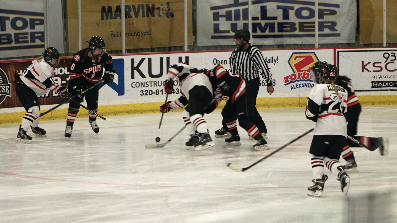 [Face-off taken by Alexis in the offensive zone while Mari and McKenna attempt to pin the Spuds’ sticks.]
