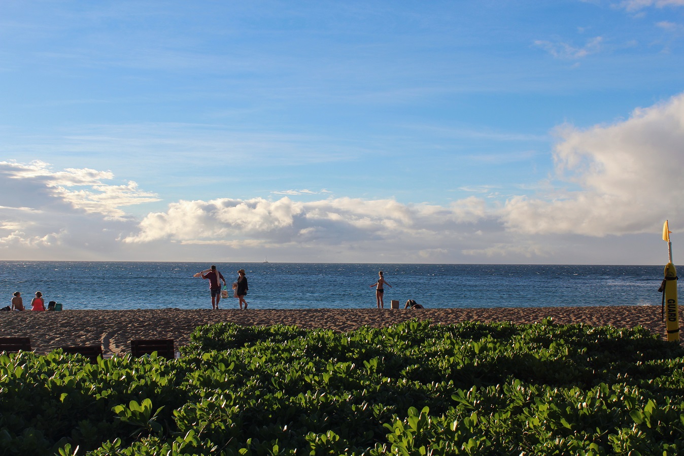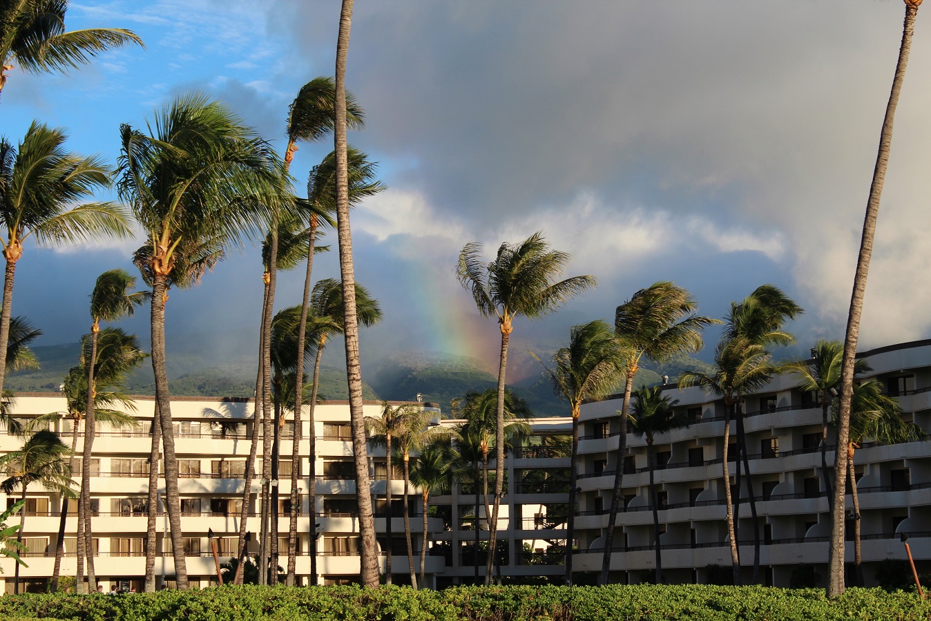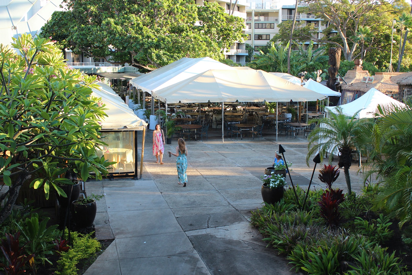 [This is looking out from our hallway window, right outside our room, of the hotel’s patio area, including an outdoor restaurant, a bar, and a swimming pool just off to the right. The building in the background is also part of the Ka’anapali Beach Hotel, an old original along this strip.]