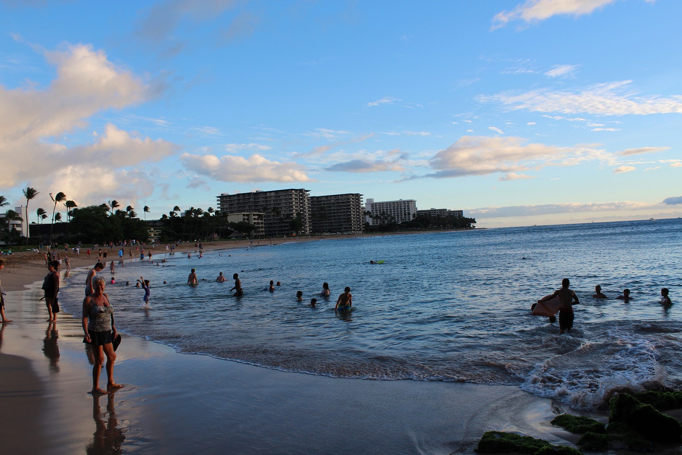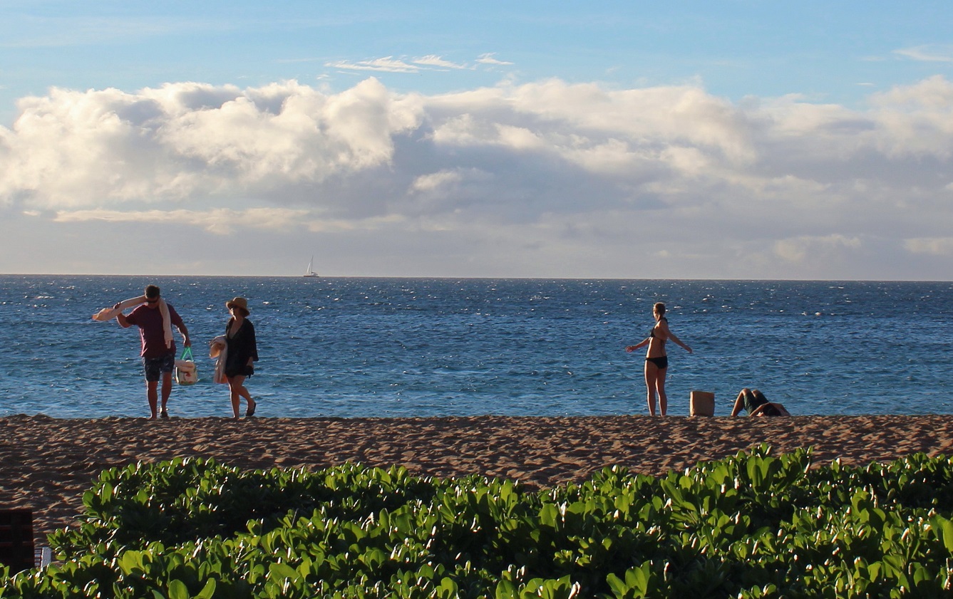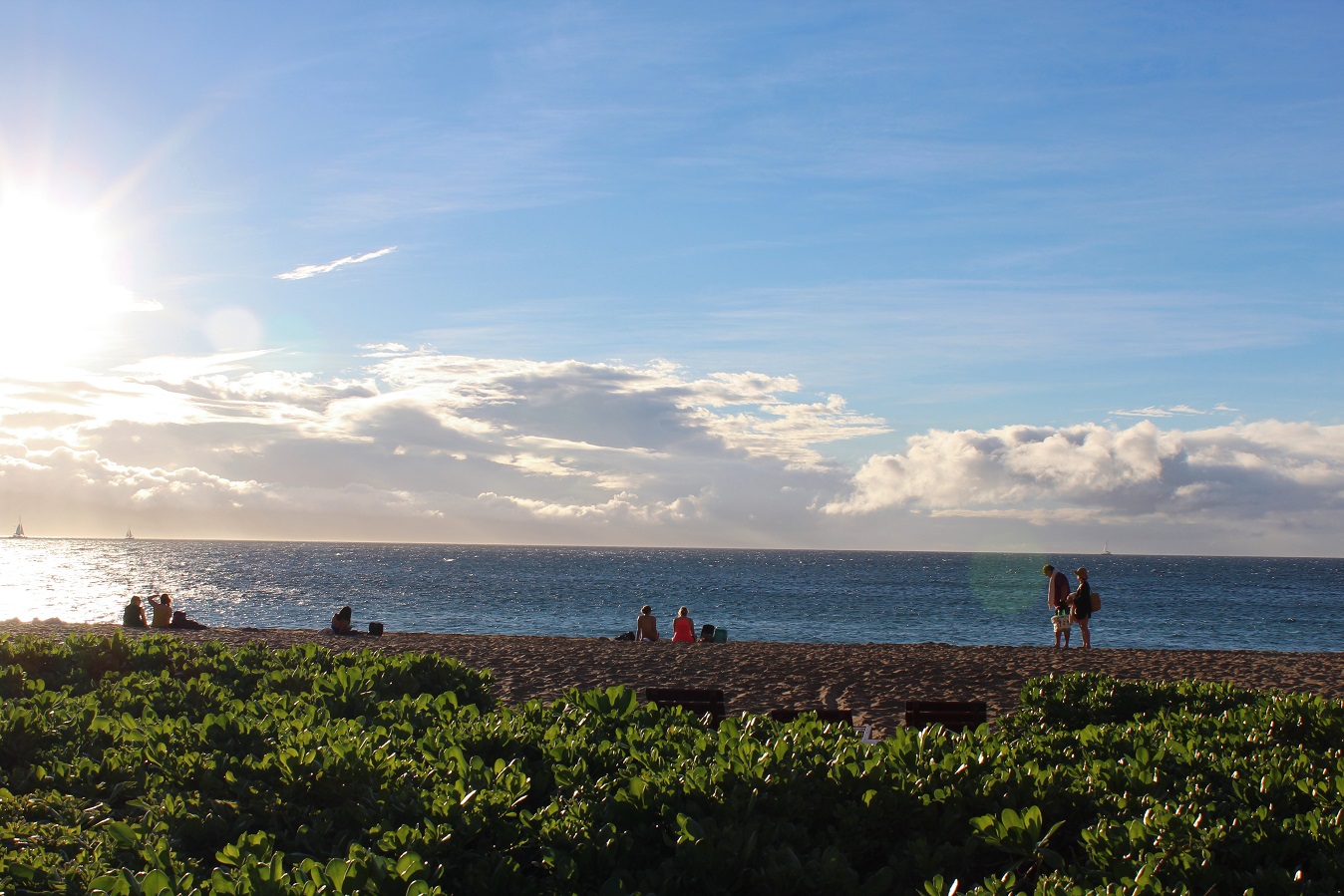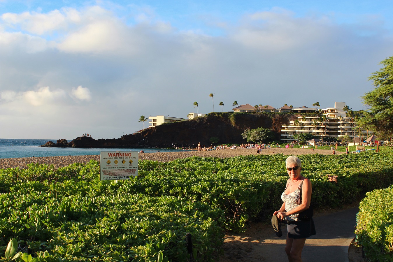 [This is looking out from our hallway window, right outside our room, of the hotel’s patio area, including an outdoor restaurant, a bar, and a swimming pool just off to the right. The building in the background is also part of the Ka’anapali Beach Hotel, an old original along this strip.]