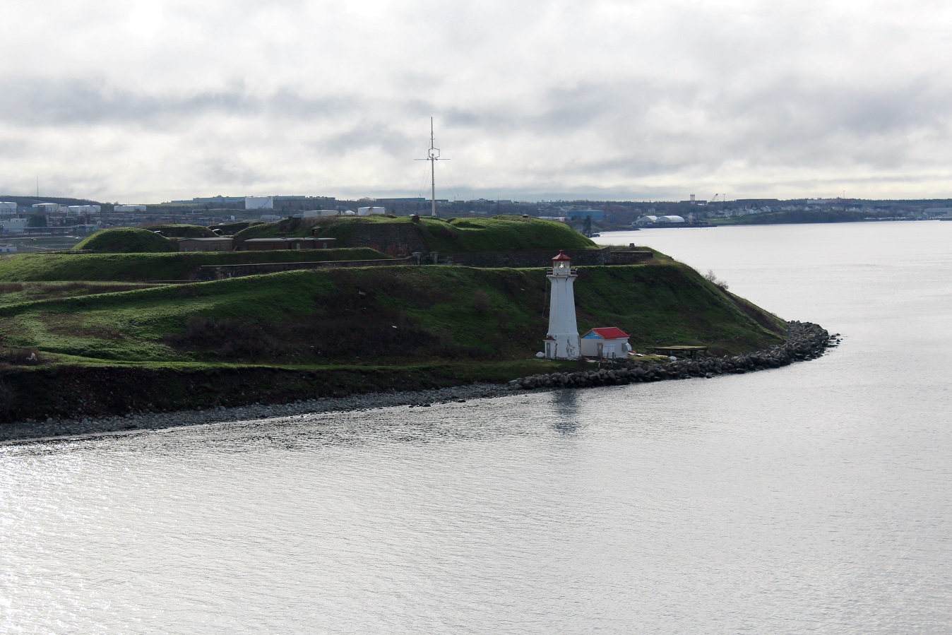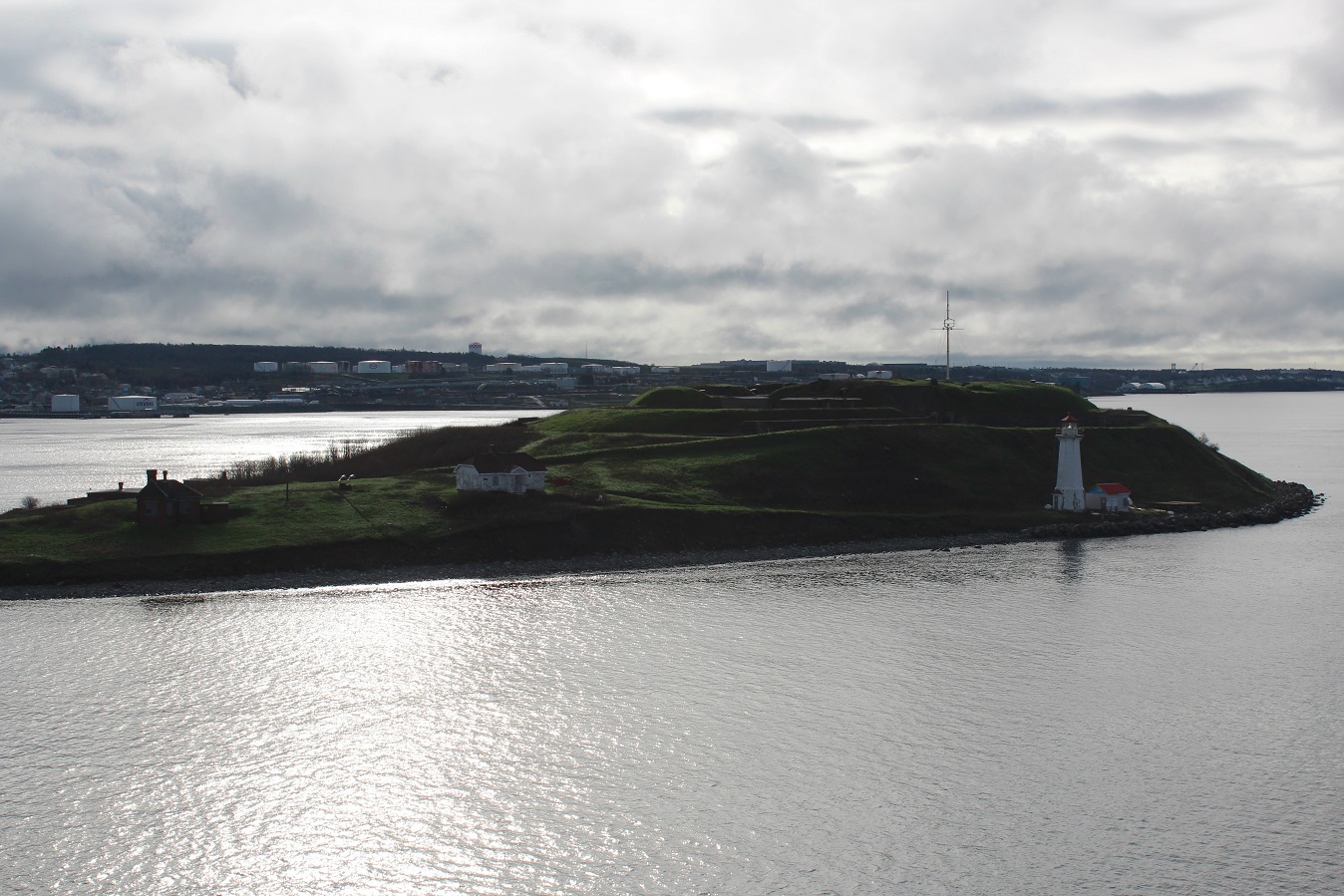 [Georges Island (named after George II of Great Britain is a glacial drumlin and the largest island entirely within the harbour limits of Halifax Harbour. The Island is the location of Fort Charlotte – named after King George’s wife Charlotte. Fort Charlotte was built during Father Le Loutre’s War, a year after Citadel Hill (Fort George). The island is now a National Historic Site of Canada. (Wikipedia)]